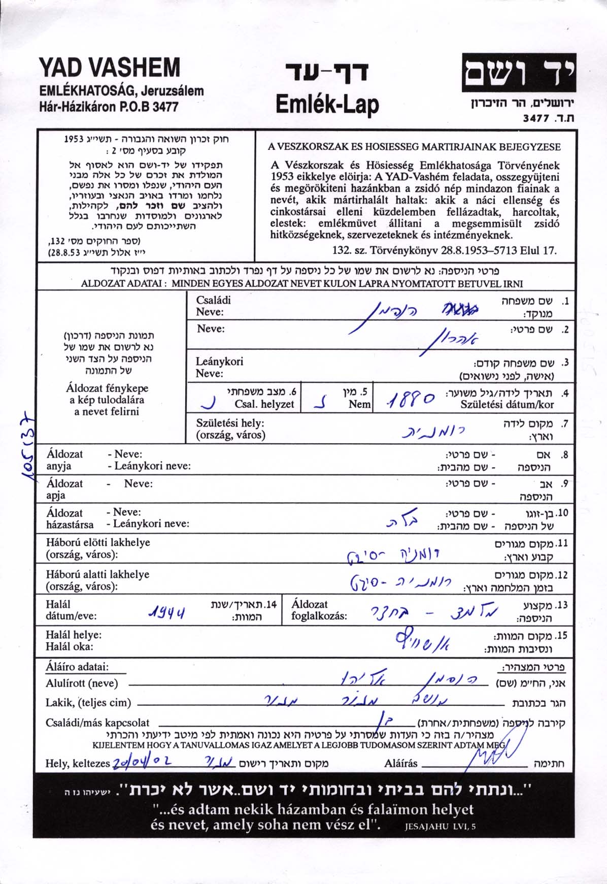 Yitzkhak Aharon Hofman est né à Sighet, Roumanie en 1888. Il était Enseignant de matière religieuse. Avant la seconde guerre mondiale il vivait à Sighet, Roumanie. Yitzkhak Aharon a été assassiné pendant la Shoah. Lieu de la mort: Auschwitz, Pologne en 1944.