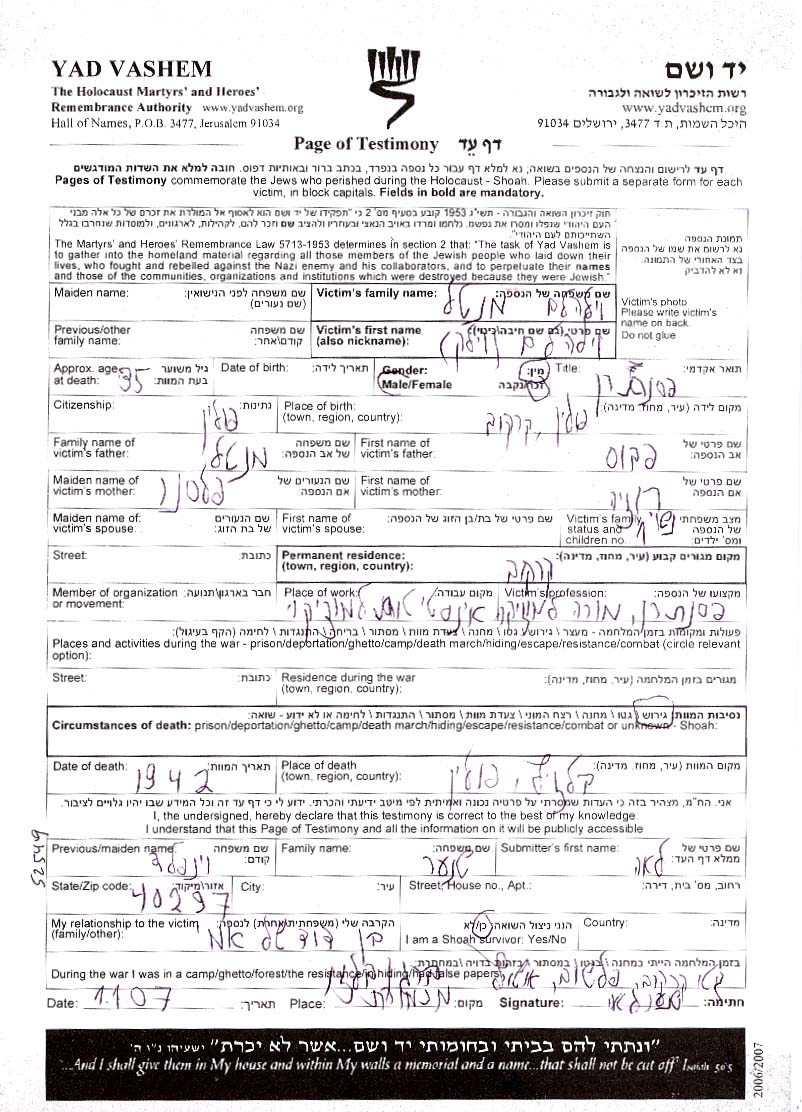 Yad Vashem - Pages of Testimony Names Memorial Collection