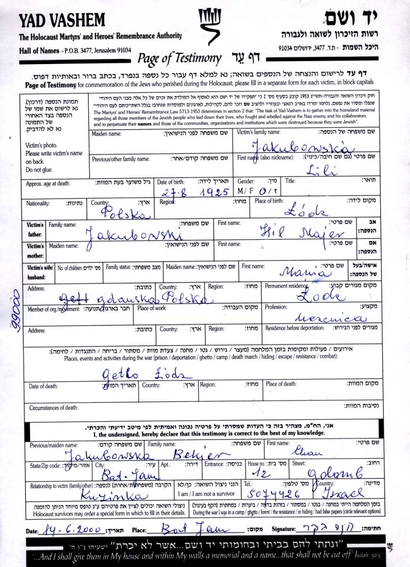 Yad Vashem - Pages of Testimony Names Memorial Collection