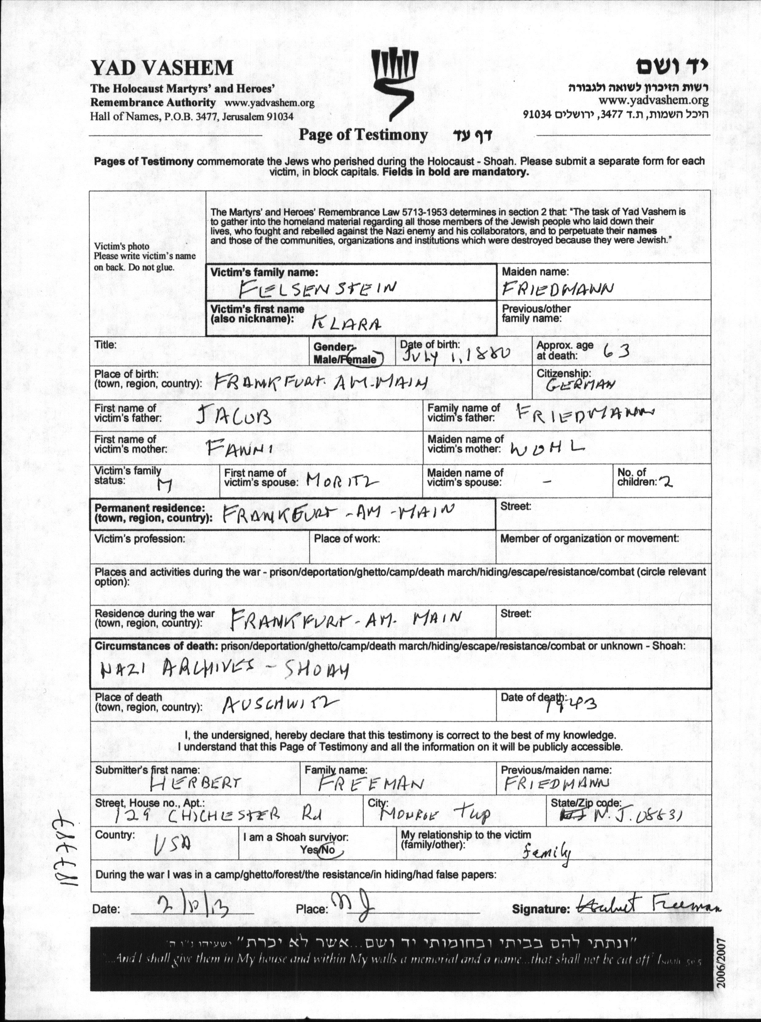 Felsenstein | Klara | 1880 | Frankfurt am Main, Allemagne | Feuille de témoignage |