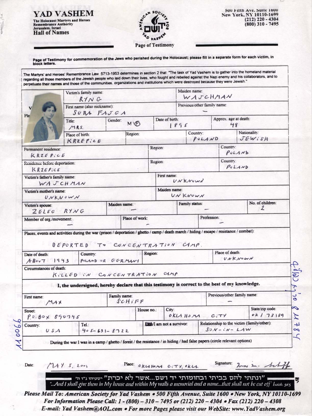 Ryng | Sura Fajga | 1895 | Krzepice, Pologne | Feuille de témoignage |
