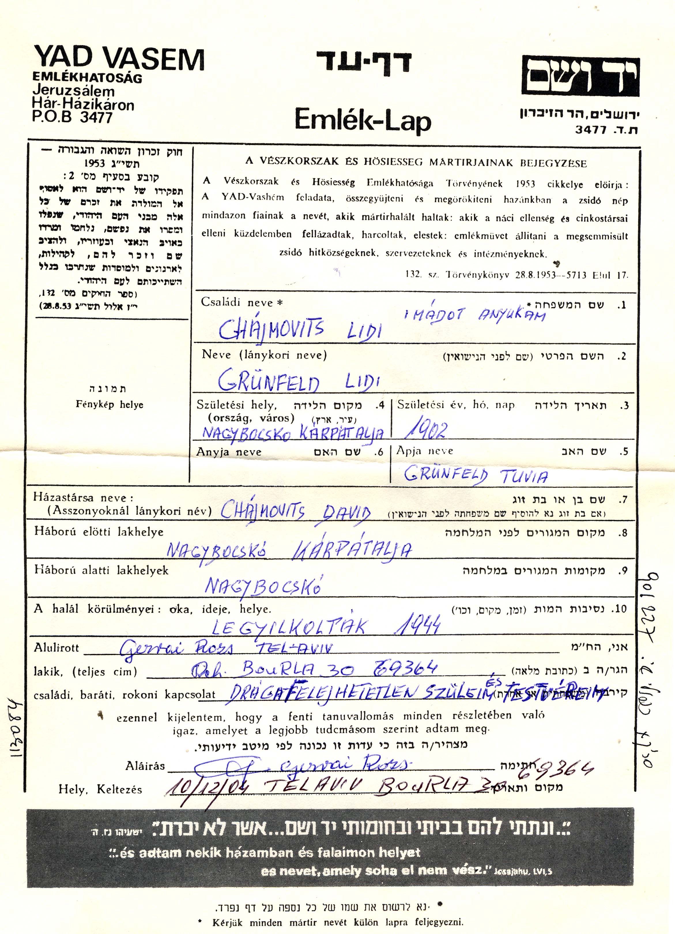 Chajmovits Lidi 1902 Nagybocsko, Tchécoslovaquie Feuille de témoignage