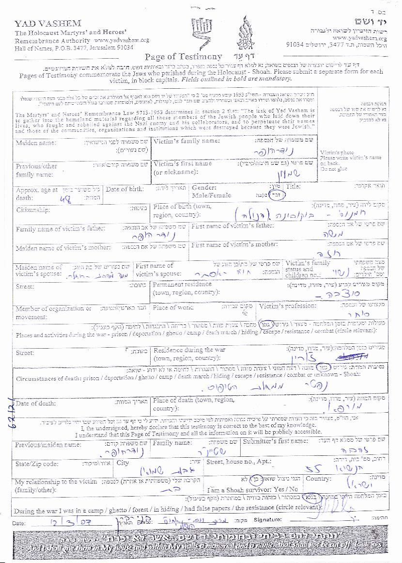 Niderhofer | Shimon | Suceava, Roumanie | Feuille de témoignage | |