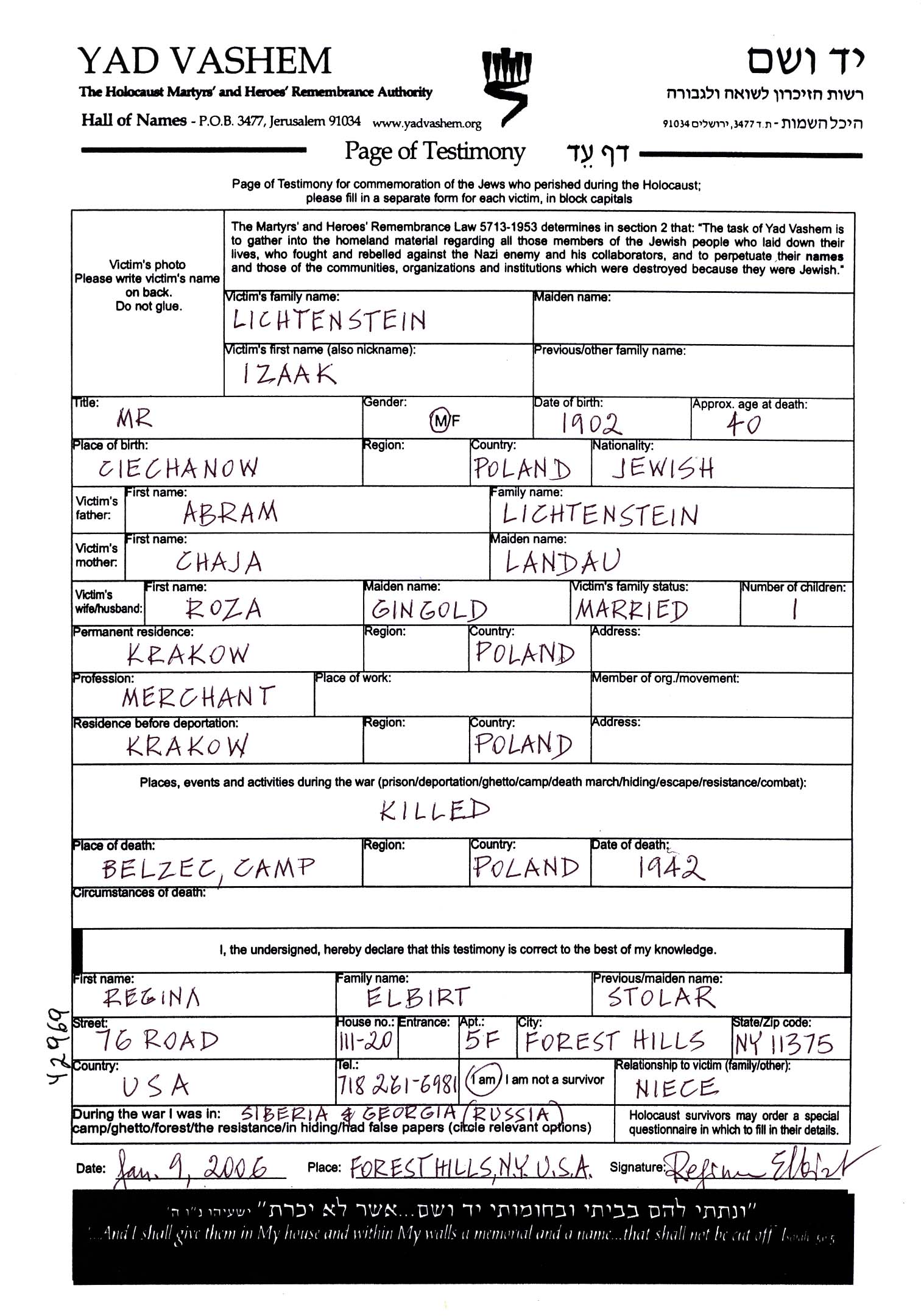 Lichtensztejn Izaak 1902 Krakow, Pologne Feuille de témoignage