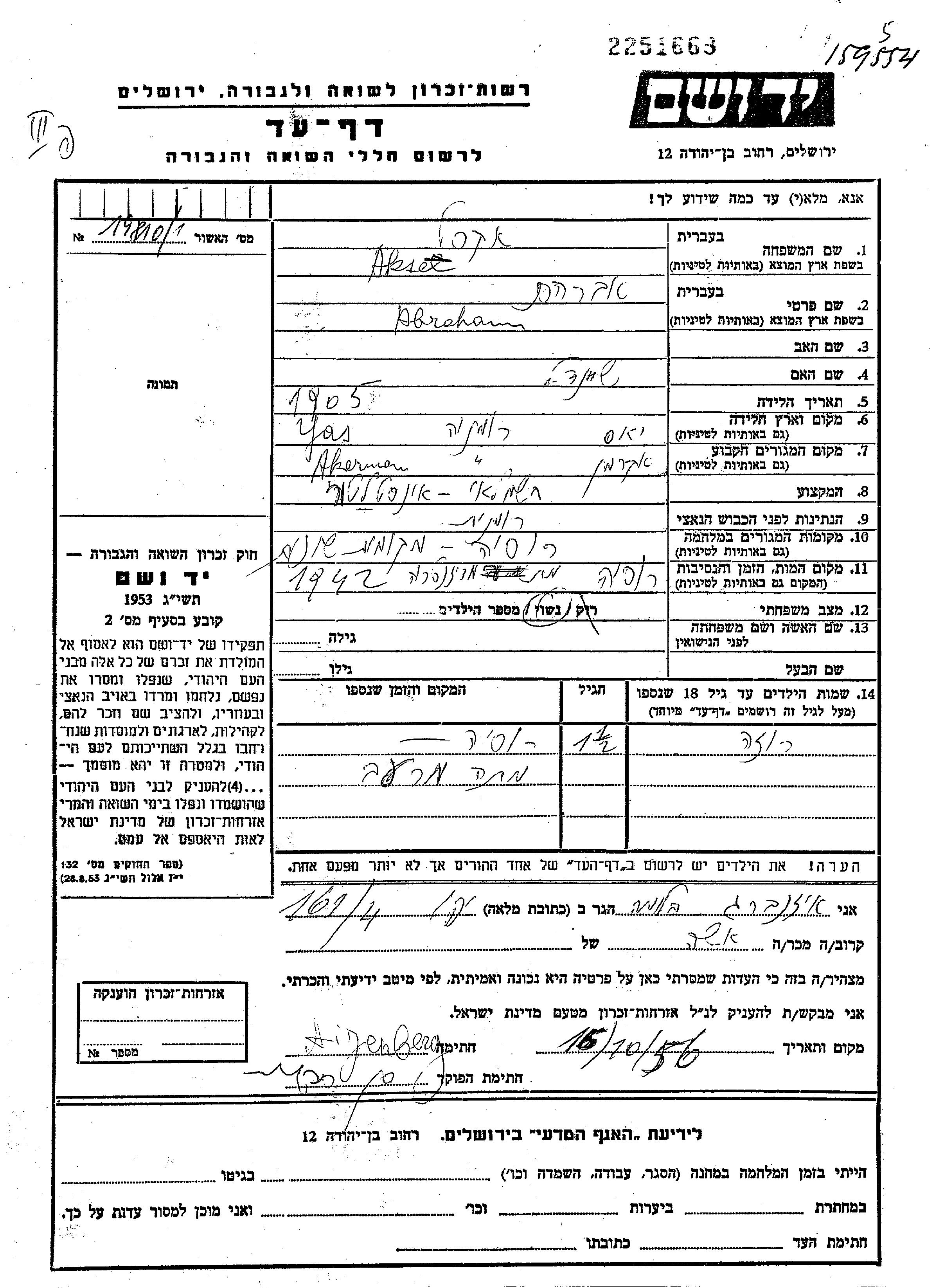 Aksel Abraham 1905 Akerman, Roumanie Feuille de témoignage