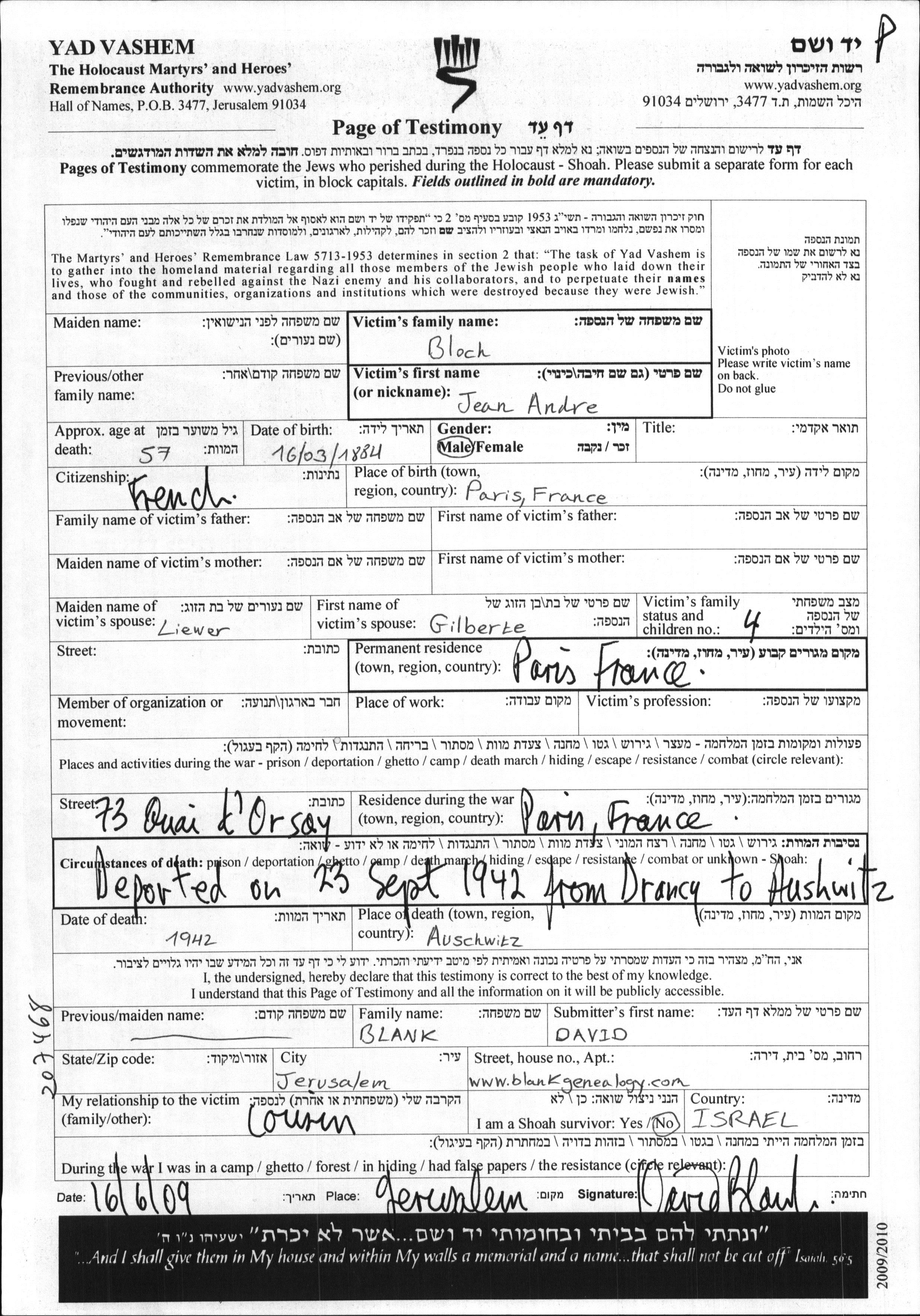Bloch | Jean Andre Zhan Andree | Paris, France | Feuille de témoignage | |