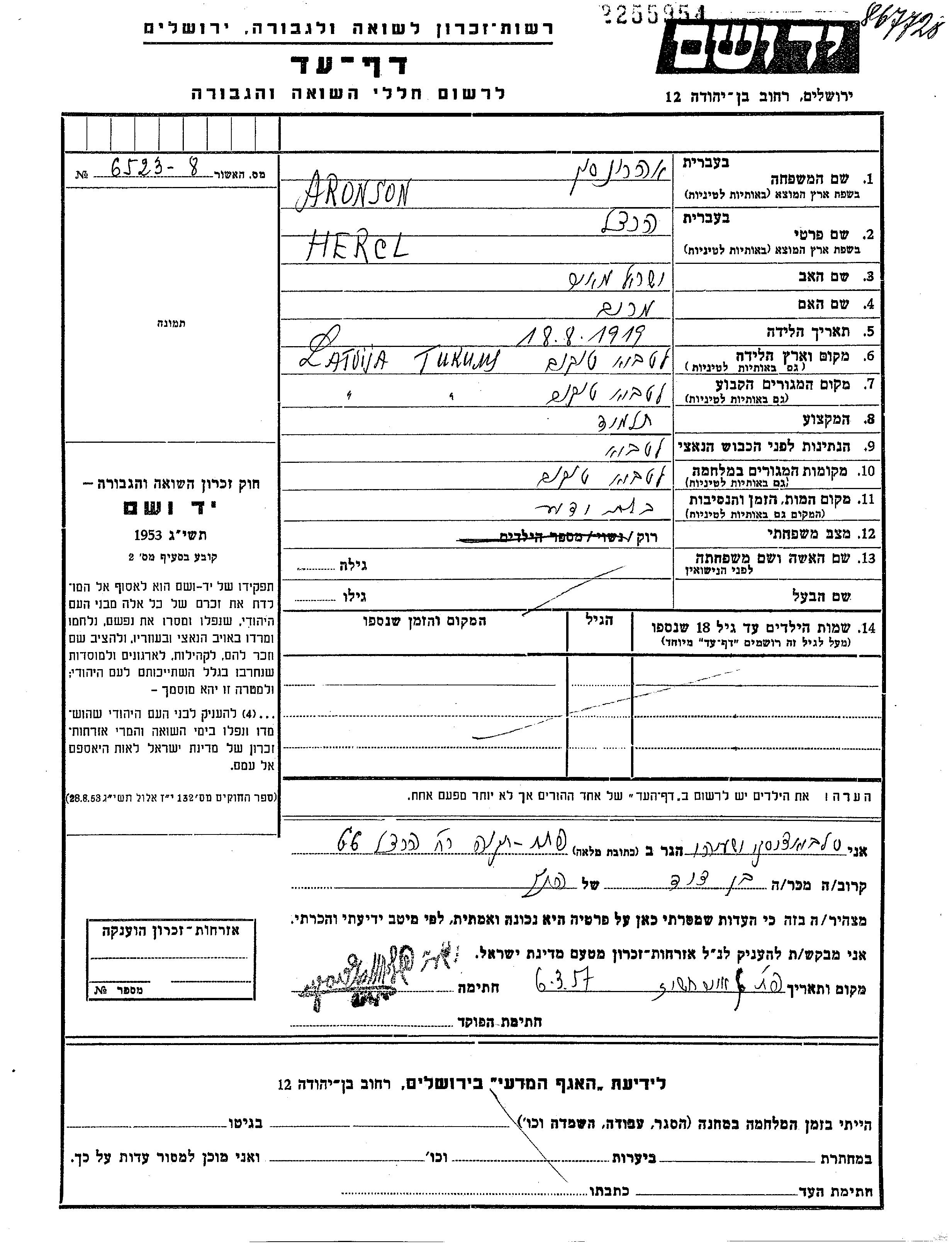 Hercl Aronson est né à endroit inconnu en 1919. Il était Élève. Avant la seconde guerre mondiale il vivait à Tukums, Lettonie.