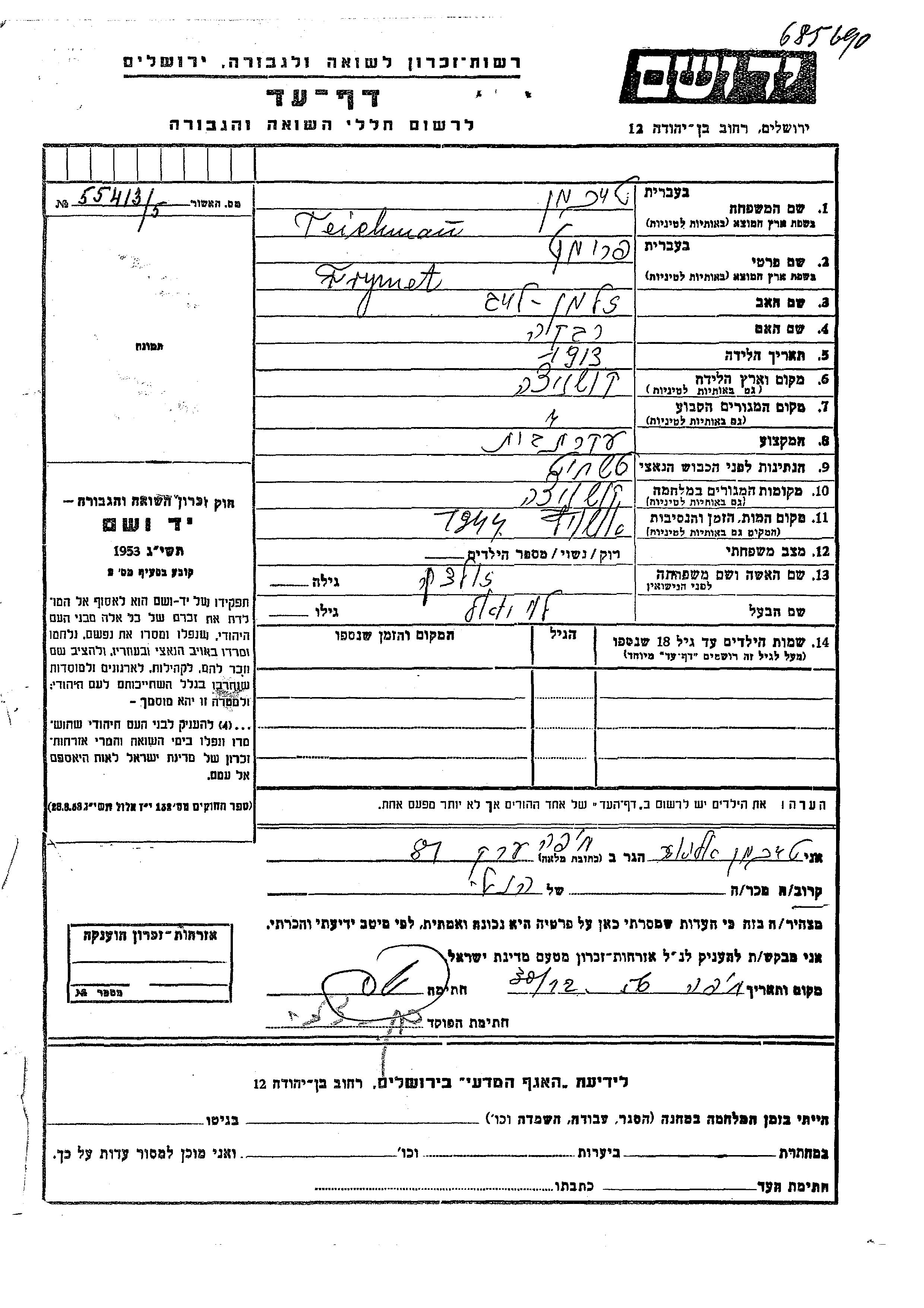 Zoldan Teikhman Frimet Frida 1916 Kusnica, Tchécoslovaquie Feuille de témoignage