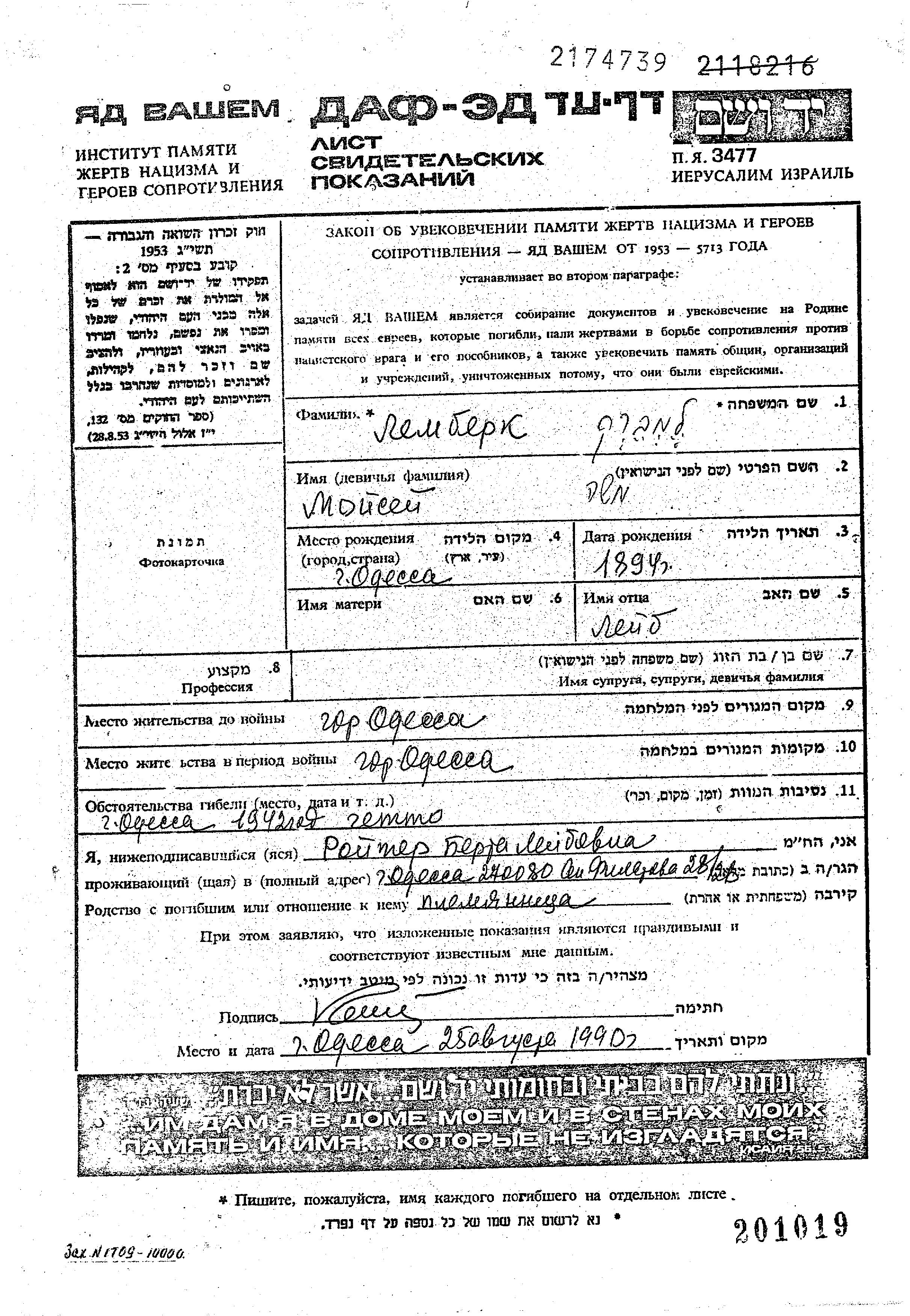Lemberk Moisei 1894 Odessa, Ukraine (URSS) Feuille de témoignage