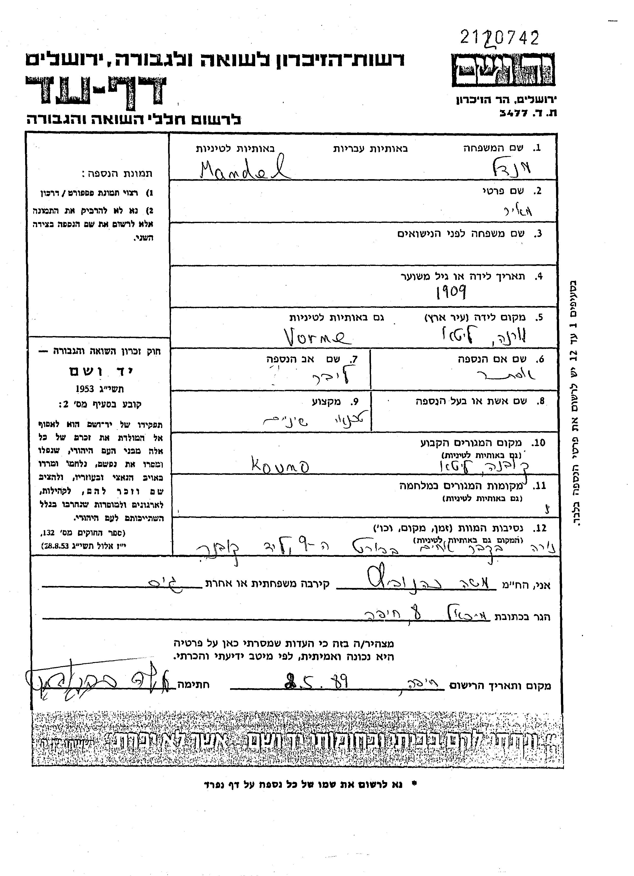 Mandel Meir 1909 Kowno, Lituanie Feuille de témoignage