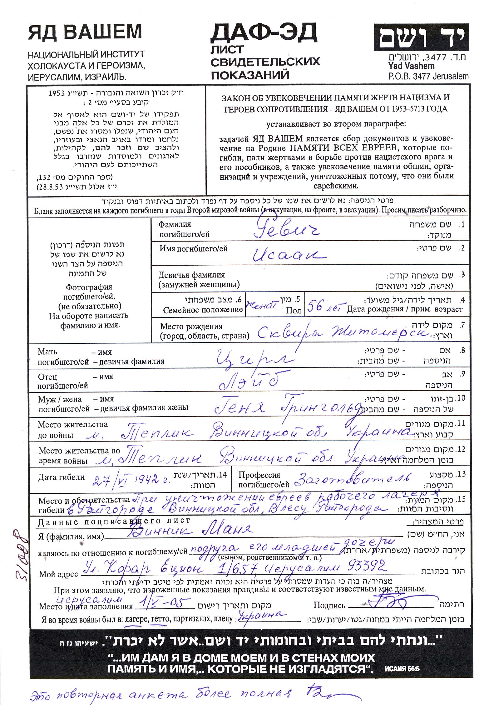 Revich Isaak Teplik, Ukraine (URSS) Feuille de témoignage