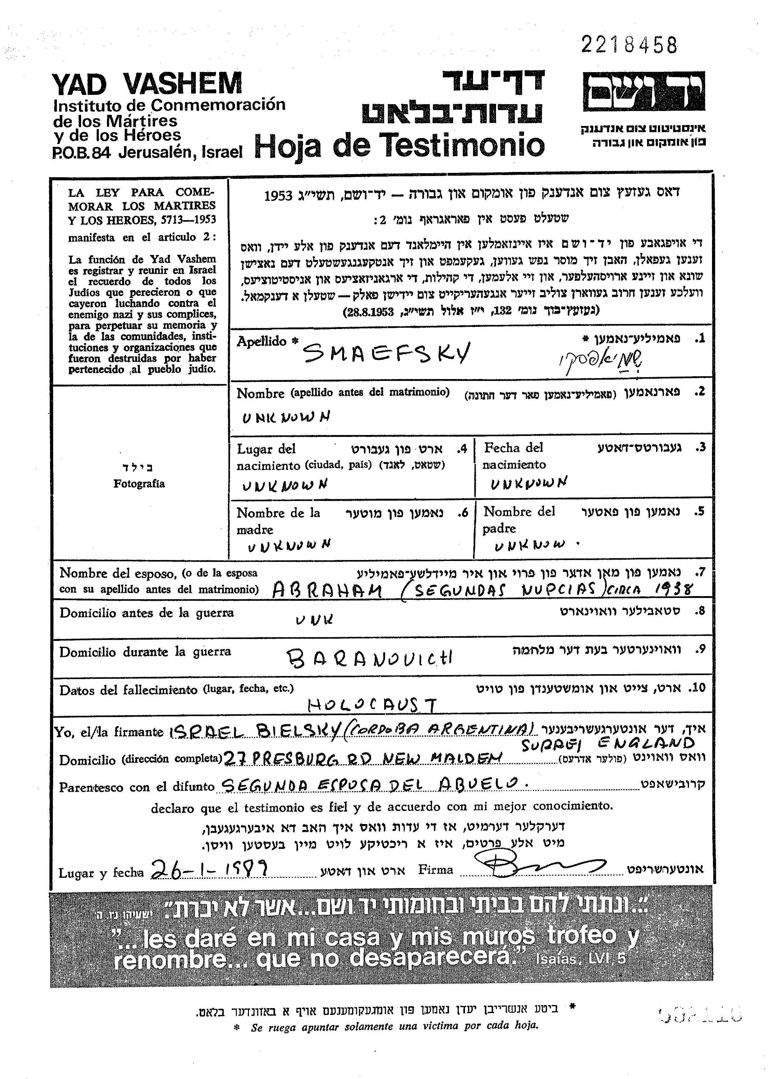 Smaefsky prénom inconnu endroit inconnu, Feuille de témoignage
