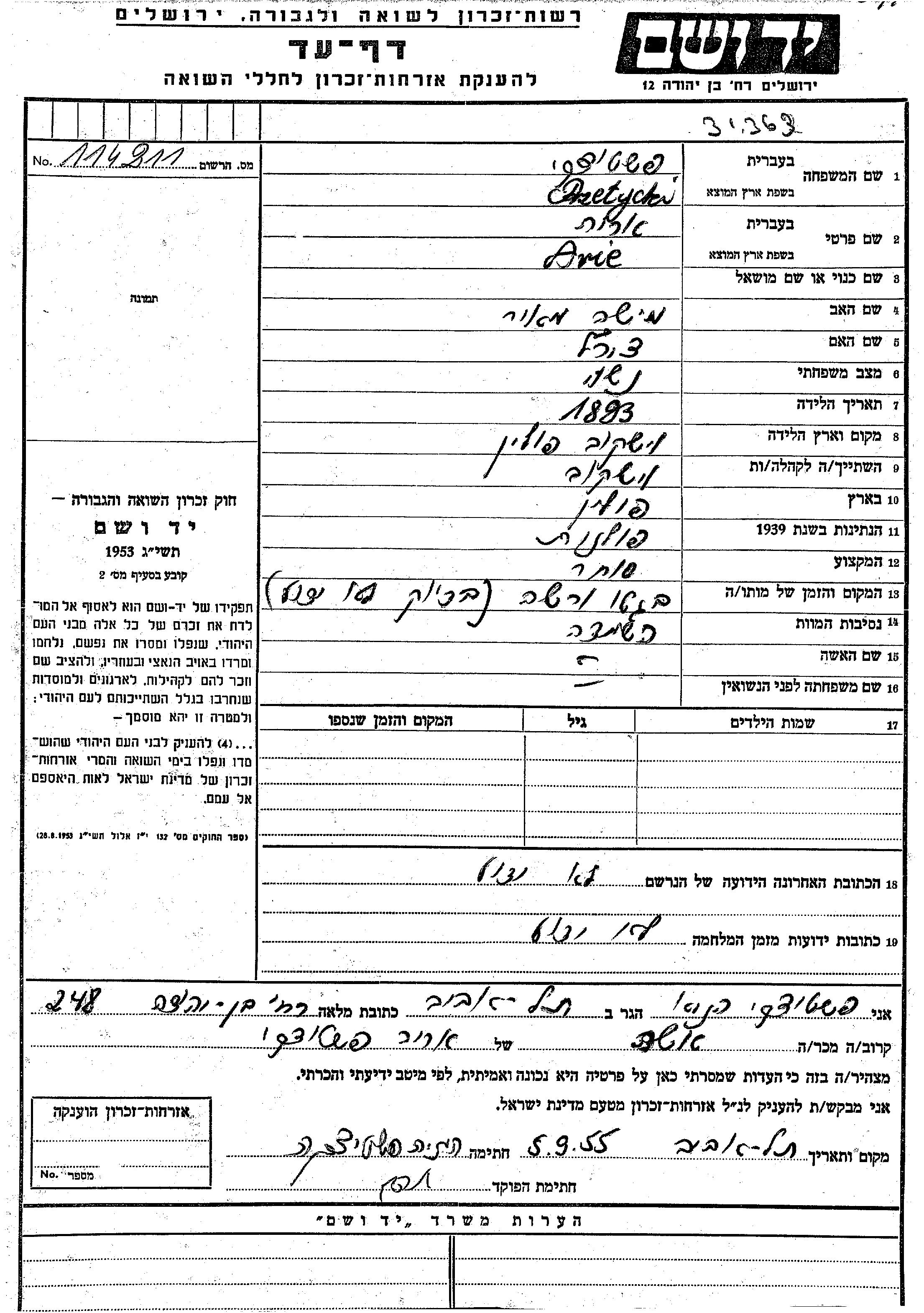 Pshetitzki Yehuda Arie 1897 Wyszkow, Pologne Feuille de témoignage
