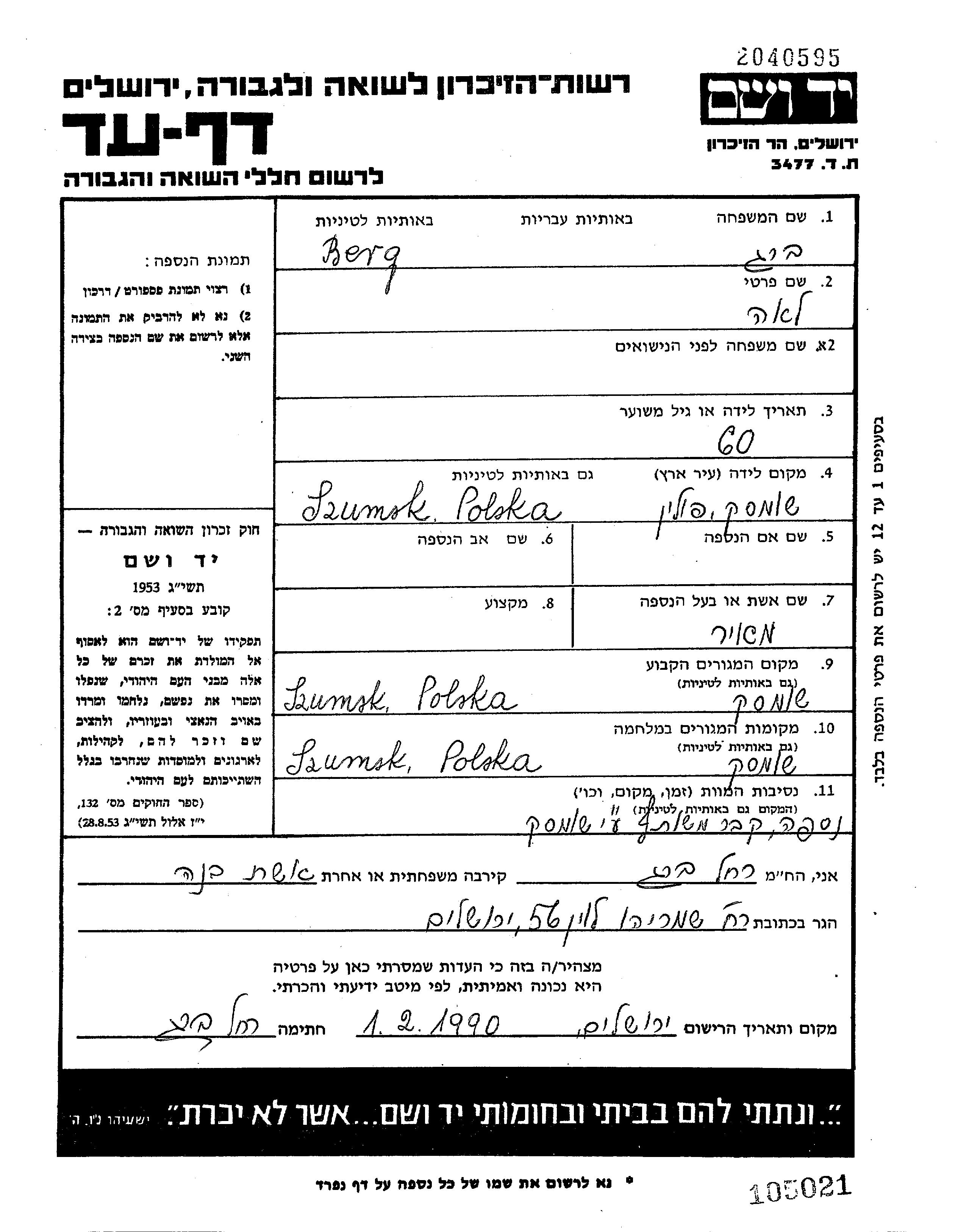 Berg Lea Szumsk, Pologne Feuille de témoignage