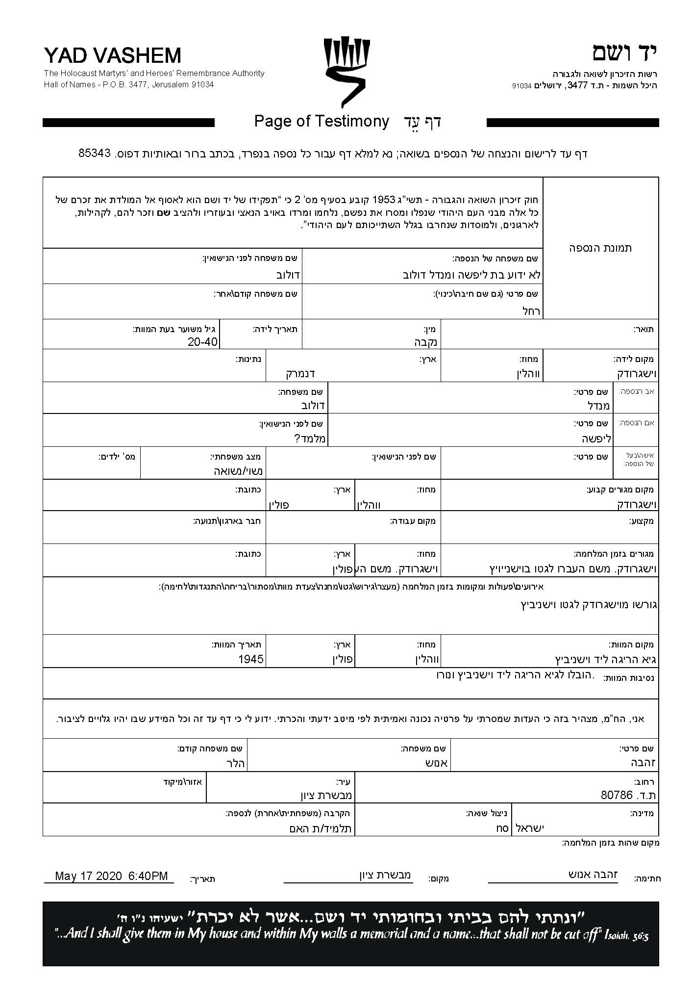 Rachel nom inconnu née Dolub est née à Wyszogrodek, Pologne, fille de Mendel et de Lifsha née Melamed. Elle était Mariée. Avant la seconde guerre mondiale elle vivait à Wyszogrodek, Pologne. Pendant la guerre, elle était à Wisniowiec, Pologne.