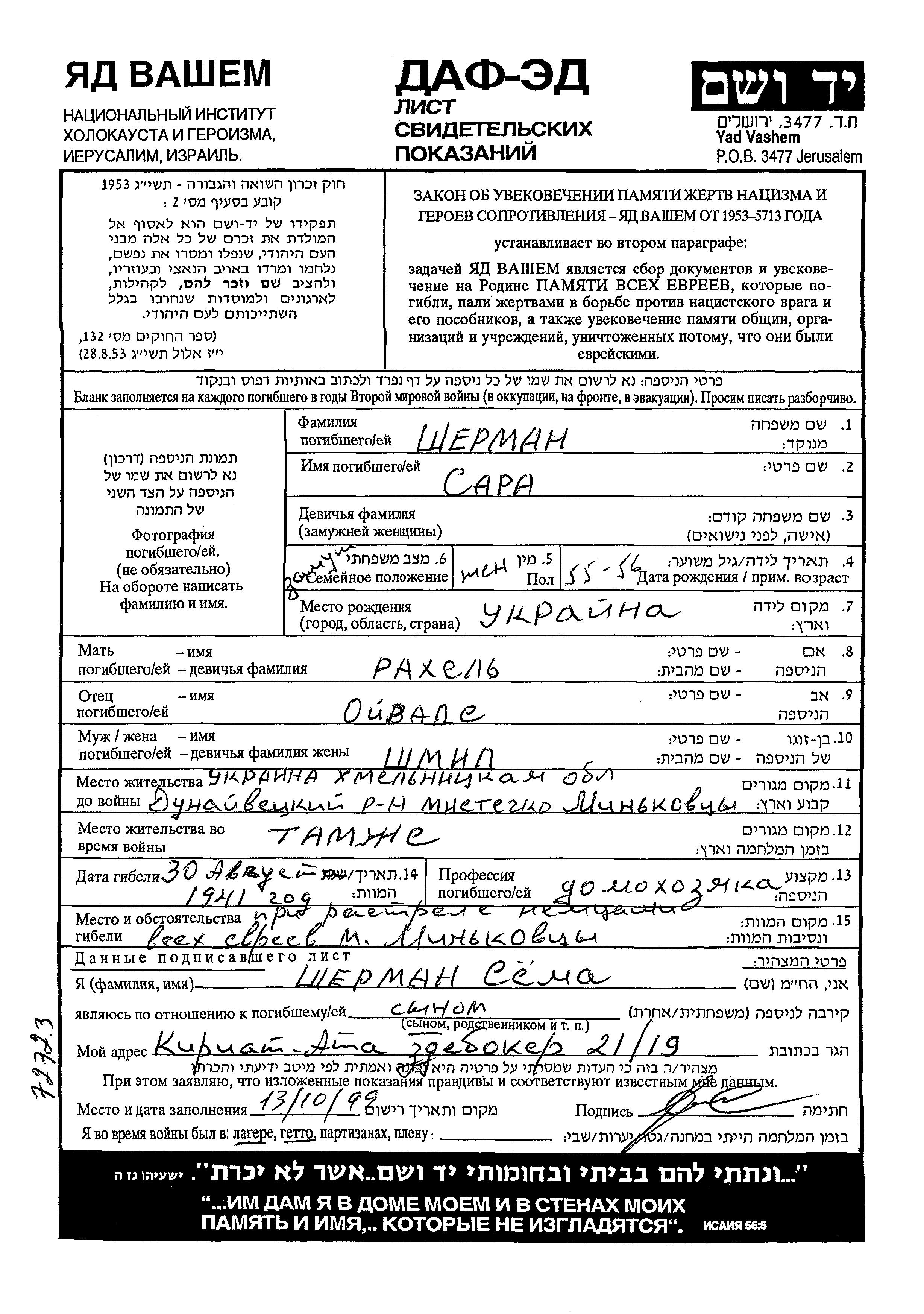 Sara Sherman est née à Minkovtsy, Ukraine (URSS) en 1876. Elle était Femme au foyer. Avant la seconde guerre mondiale elle vivait à Minkovtsy, Ukraine (URSS). Sara a été assassinée pendant la Shoah. Lieu de la mort: Minkovtsy, Ukraine (URSS) en 30/08/1941.