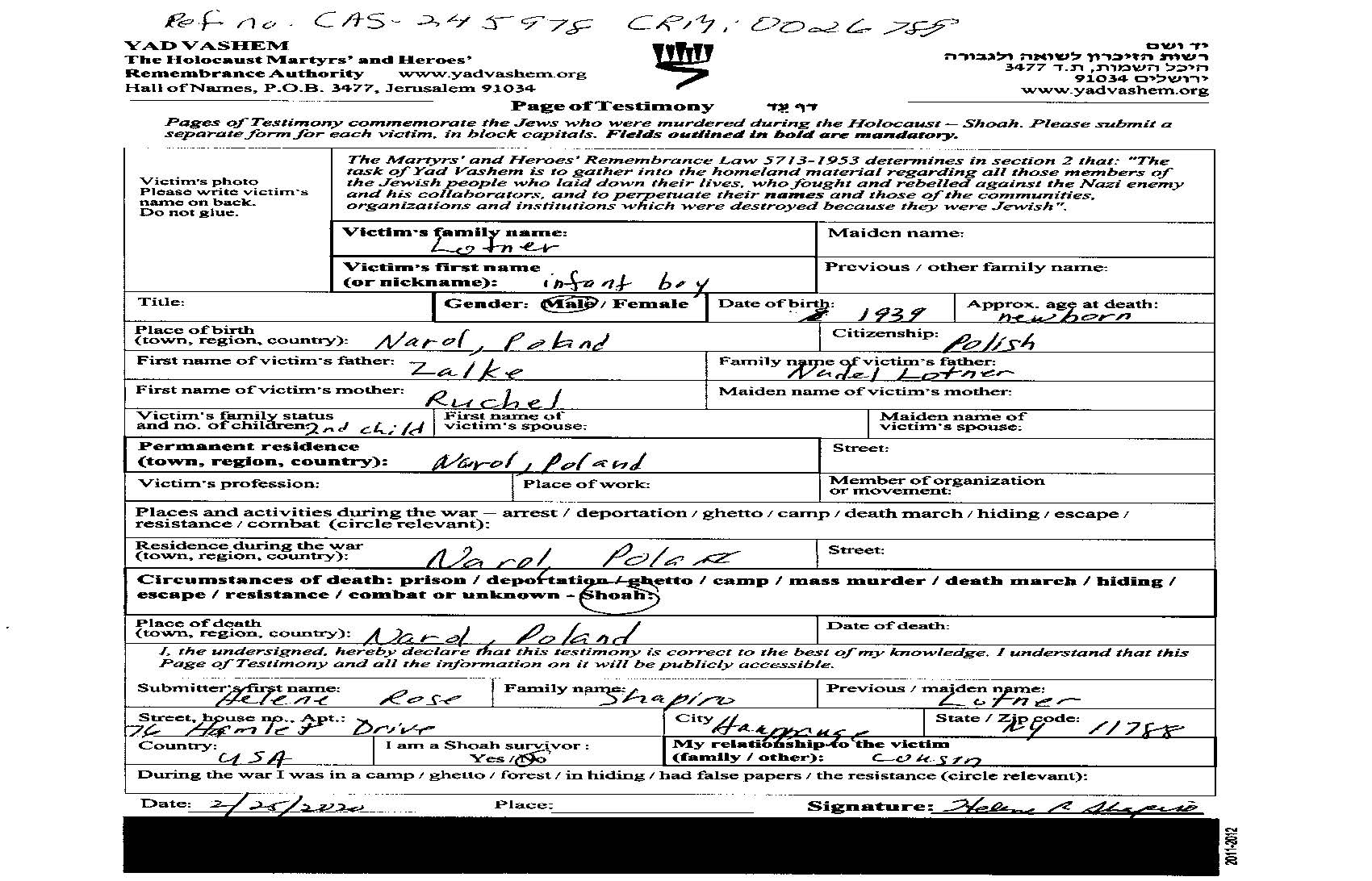 Il a été assassiné pendant la Shoah. Lieu de la mort: Narol, Pologne.