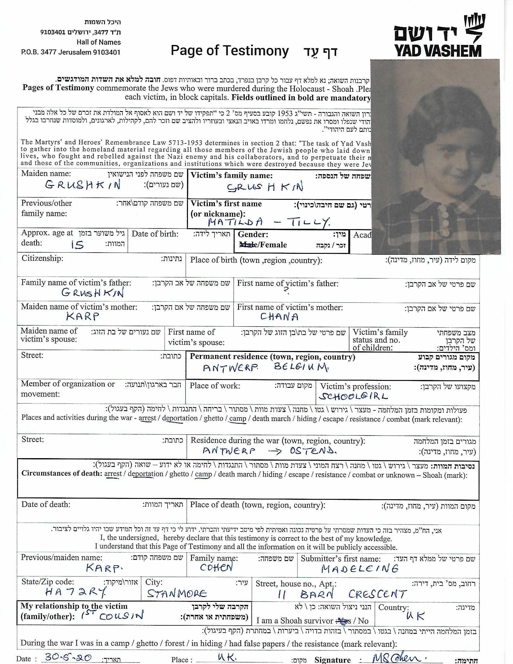 Grushkin Matilda Antwerpen, Belgique Feuille de témoignage