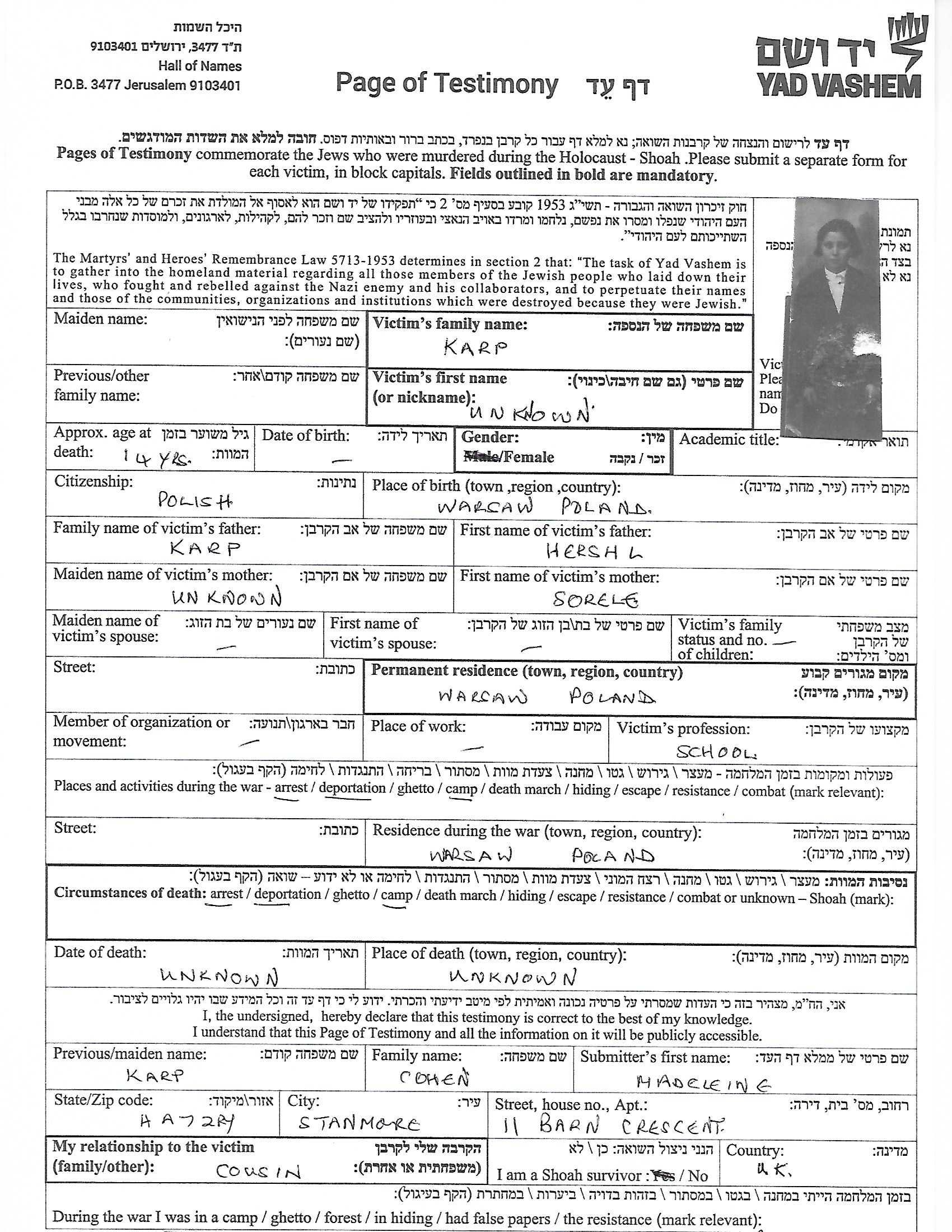 Karp prénom inconnu Warszawa, Pologne Feuille de témoignage
