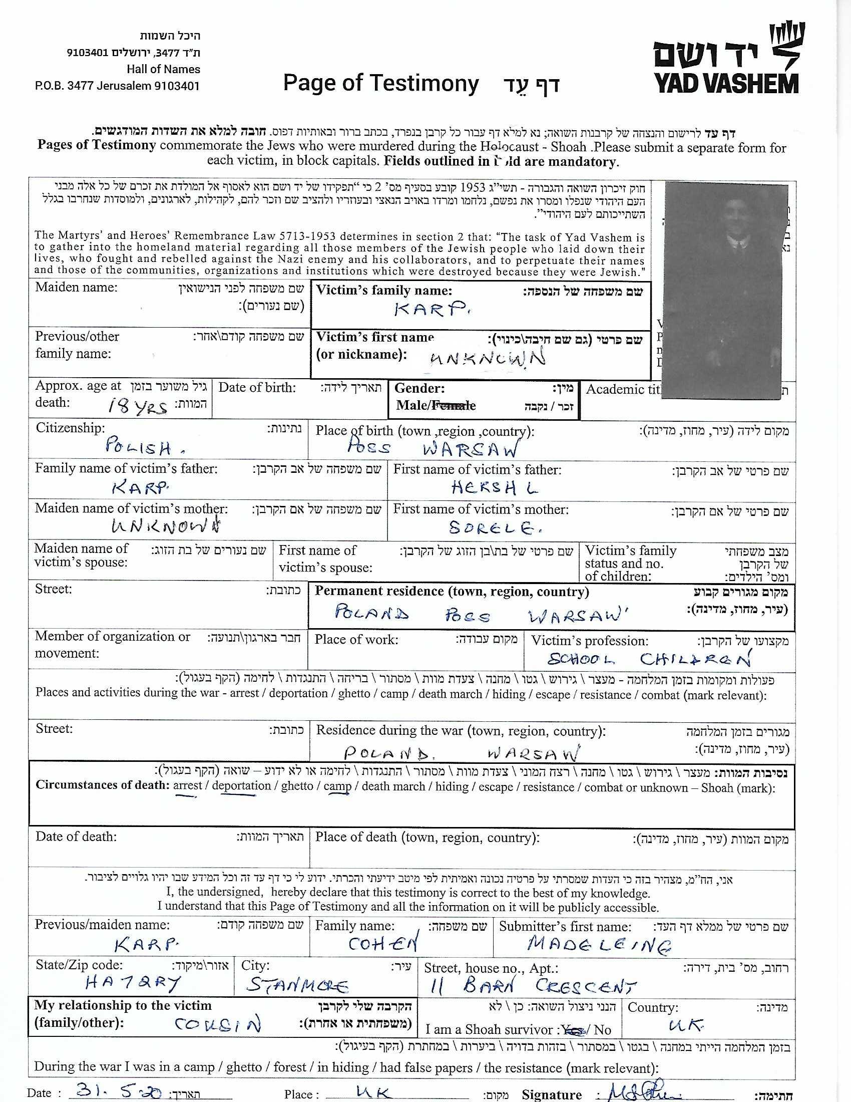 Karp prénom inconnu Warszawa, Pologne Feuille de témoignage