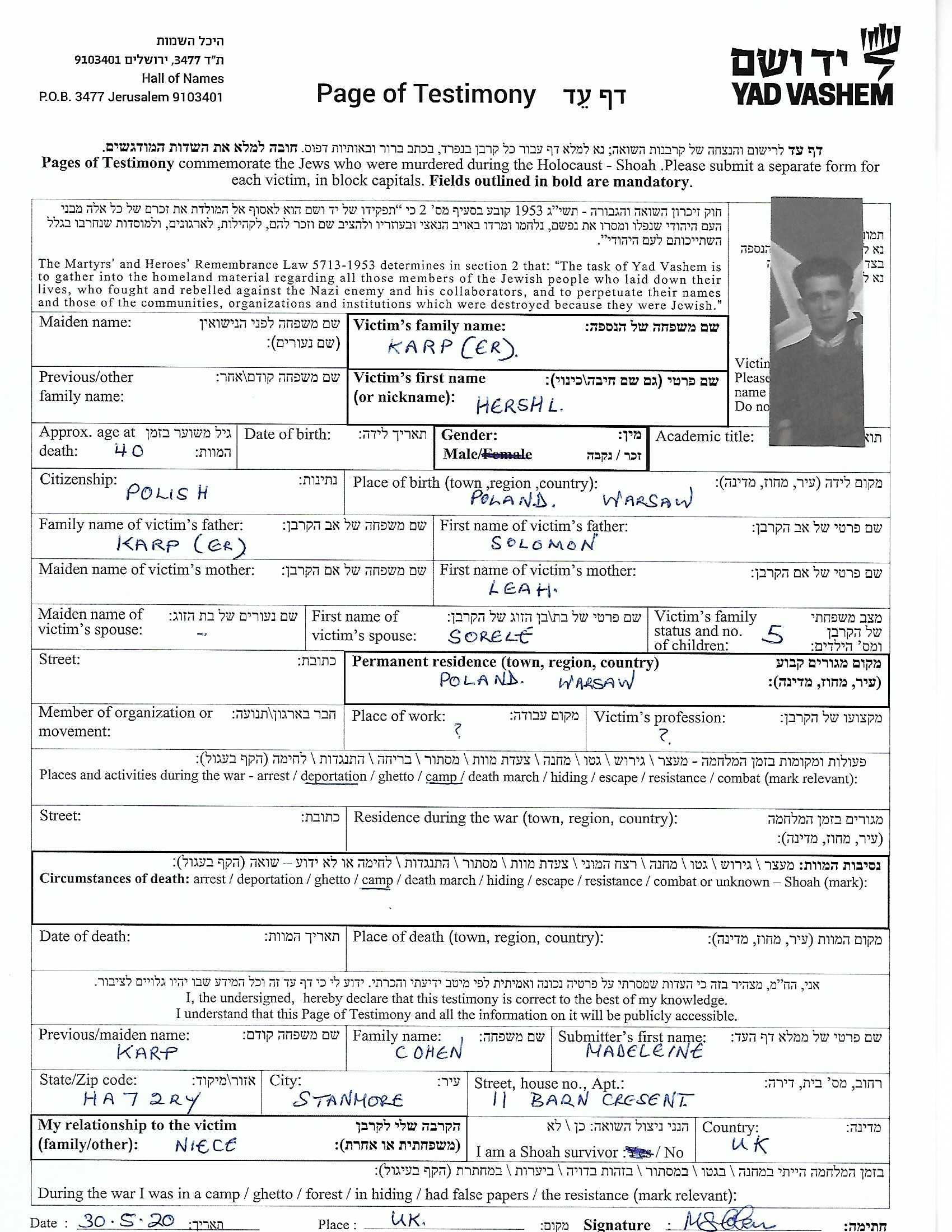 Karp Karper Hershl Warszawa, Pologne Feuille de témoignage