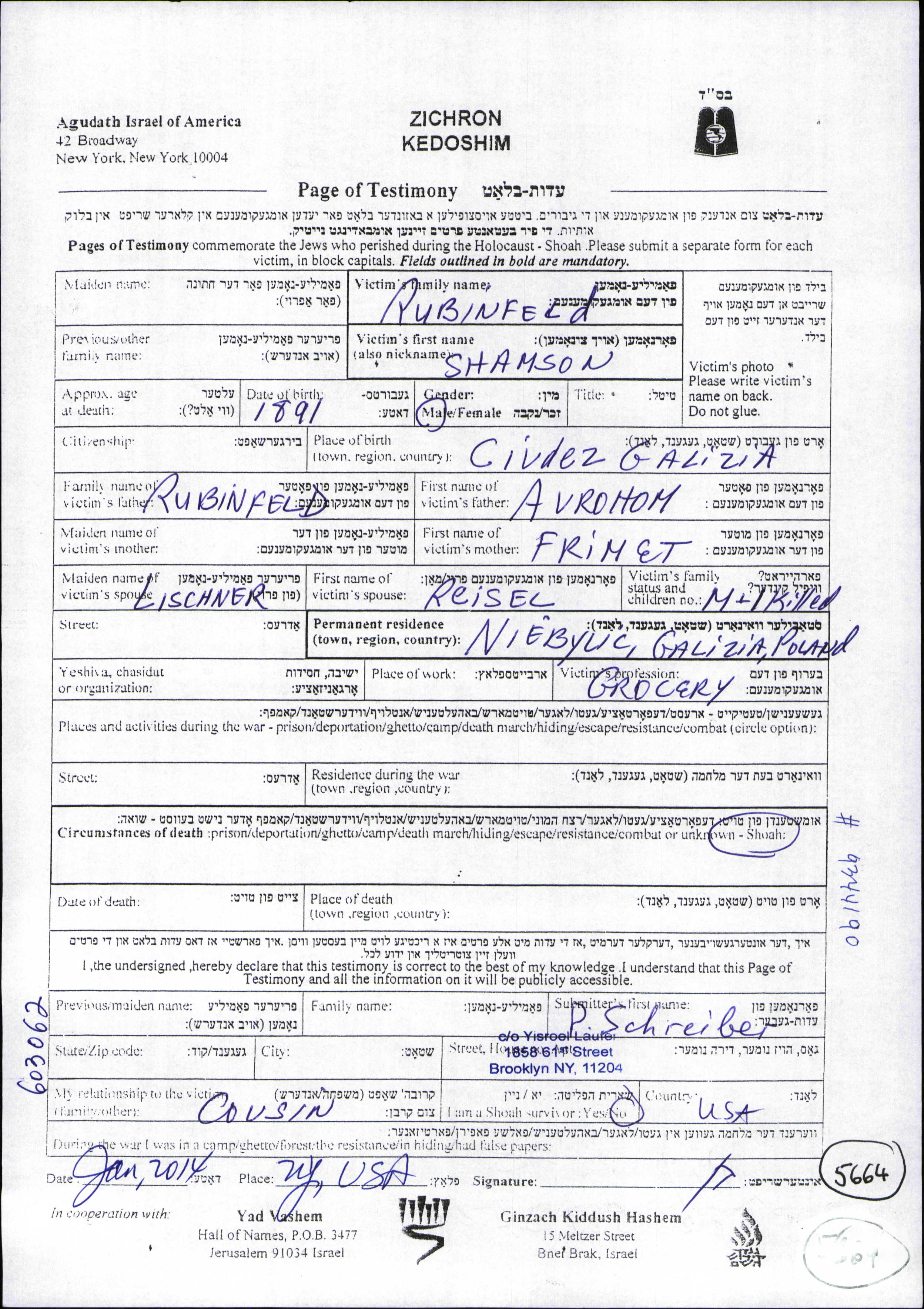 Rubinfeld | Shimshon | Nebilitz, Pologne | Feuille de témoignage |