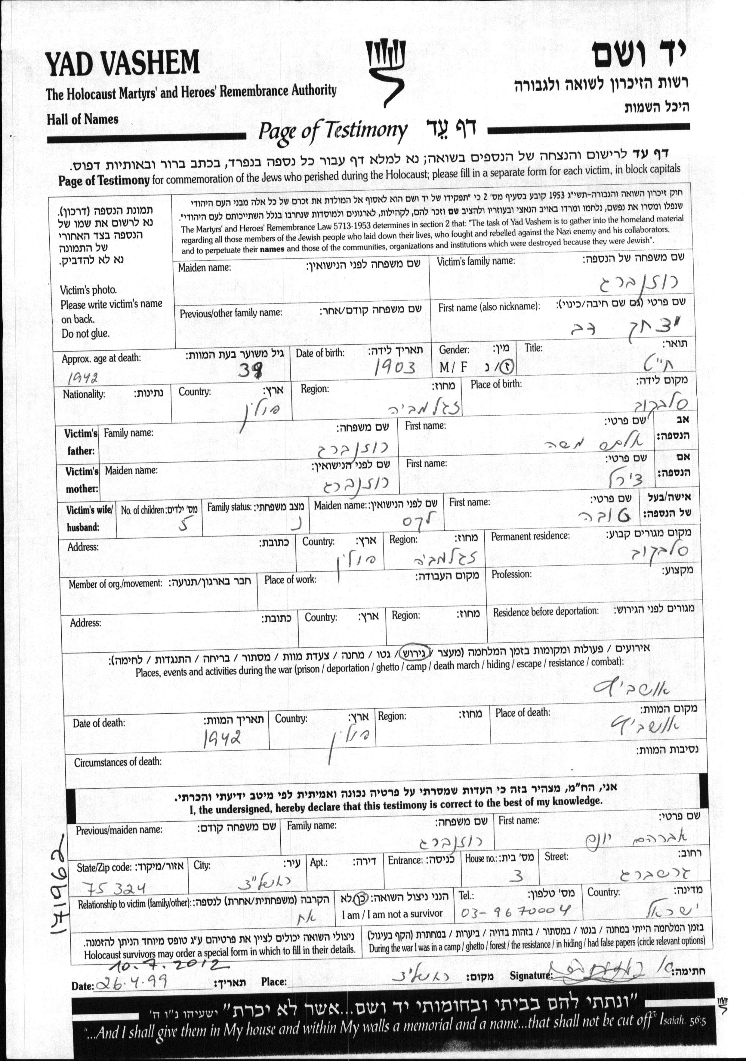 Rozenberg | Yitzkhak Dov | 1903 | Slawkow, Pologne | Feuille de témoignage |