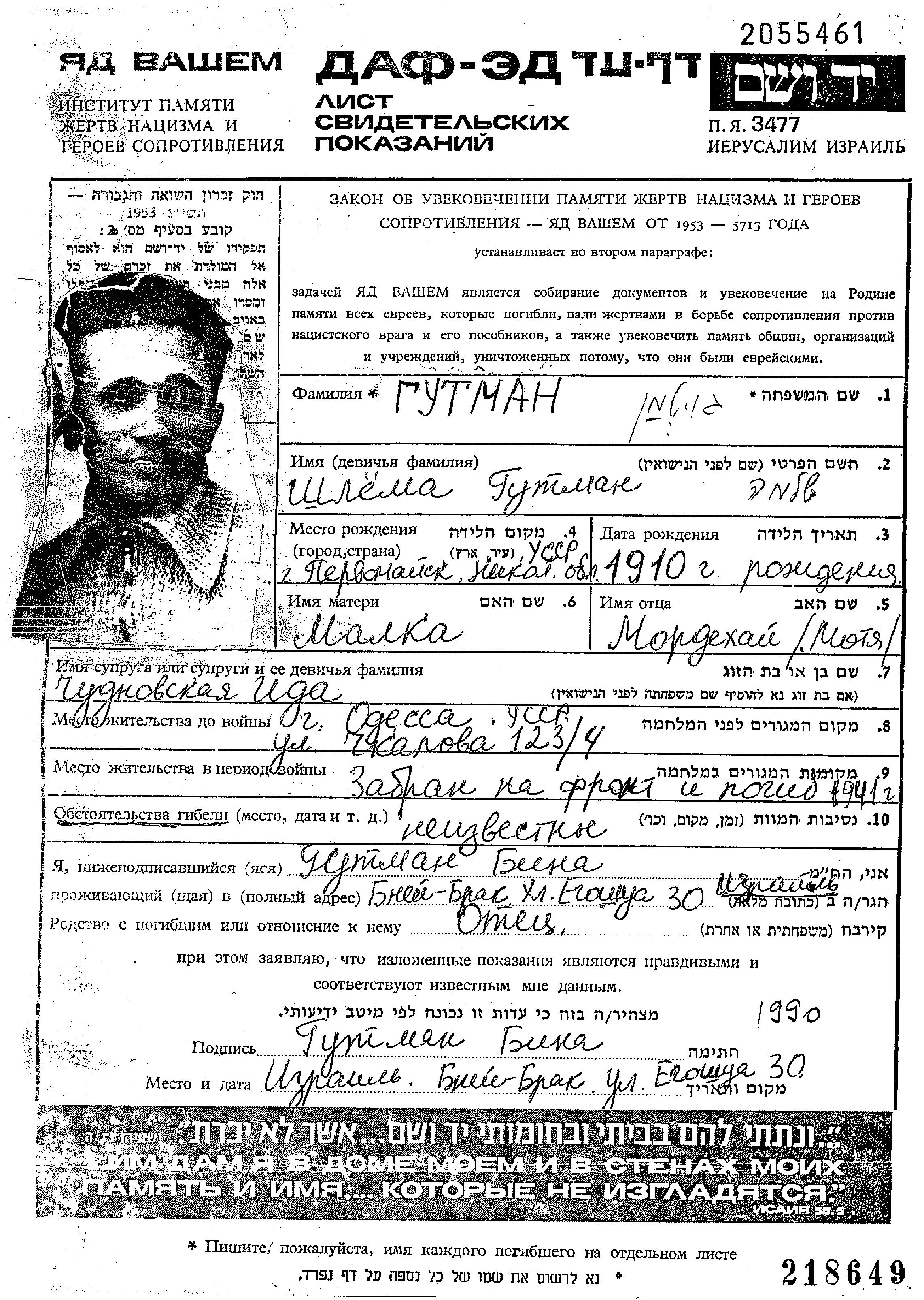 Gutman Shlioma 1910 Odessa, Ukraine (URSS) Feuille de témoignage