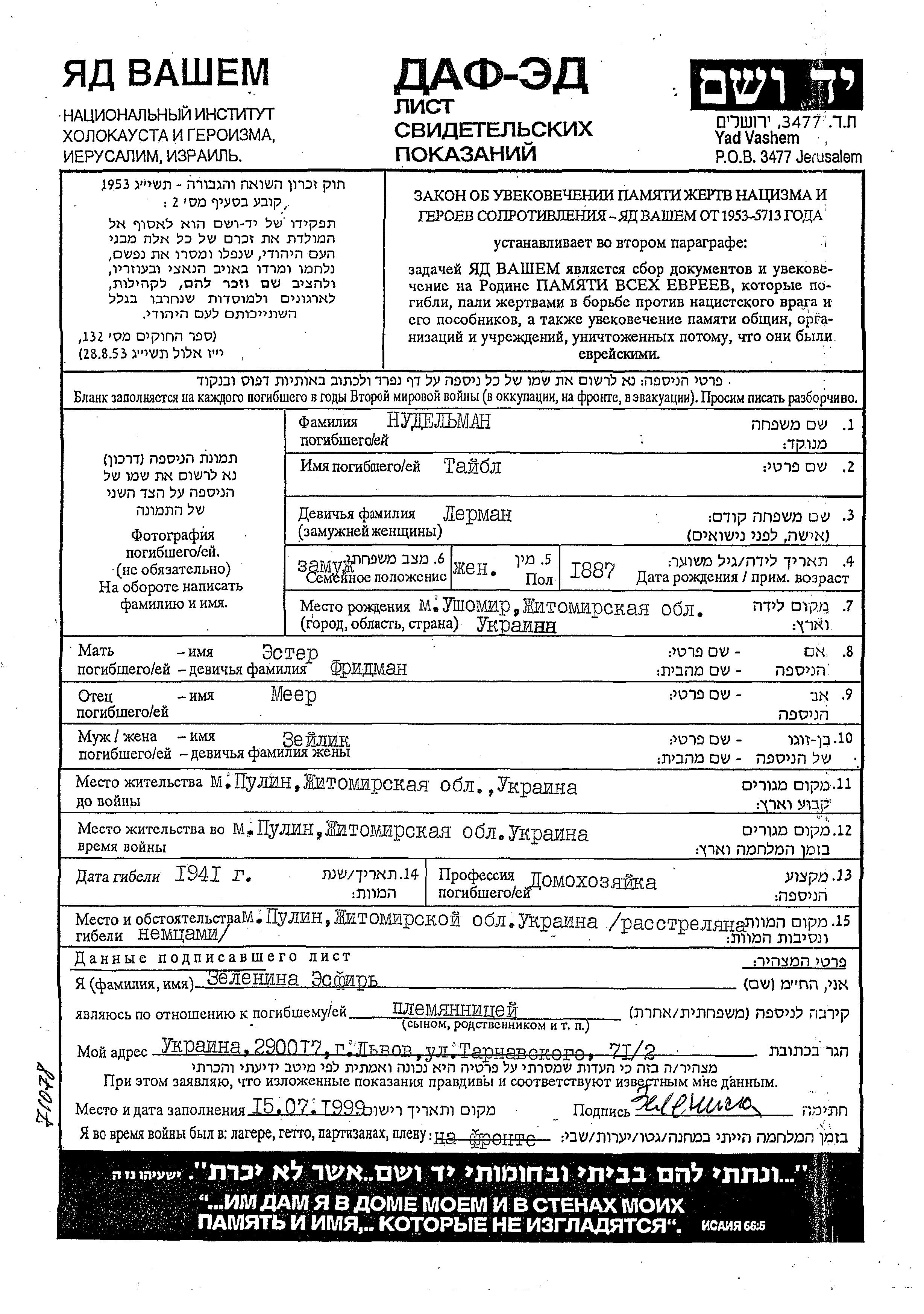 Nudelman | Taibl | 1887 | Pulin, Ukraine (URSS) | Feuille de témoignage |