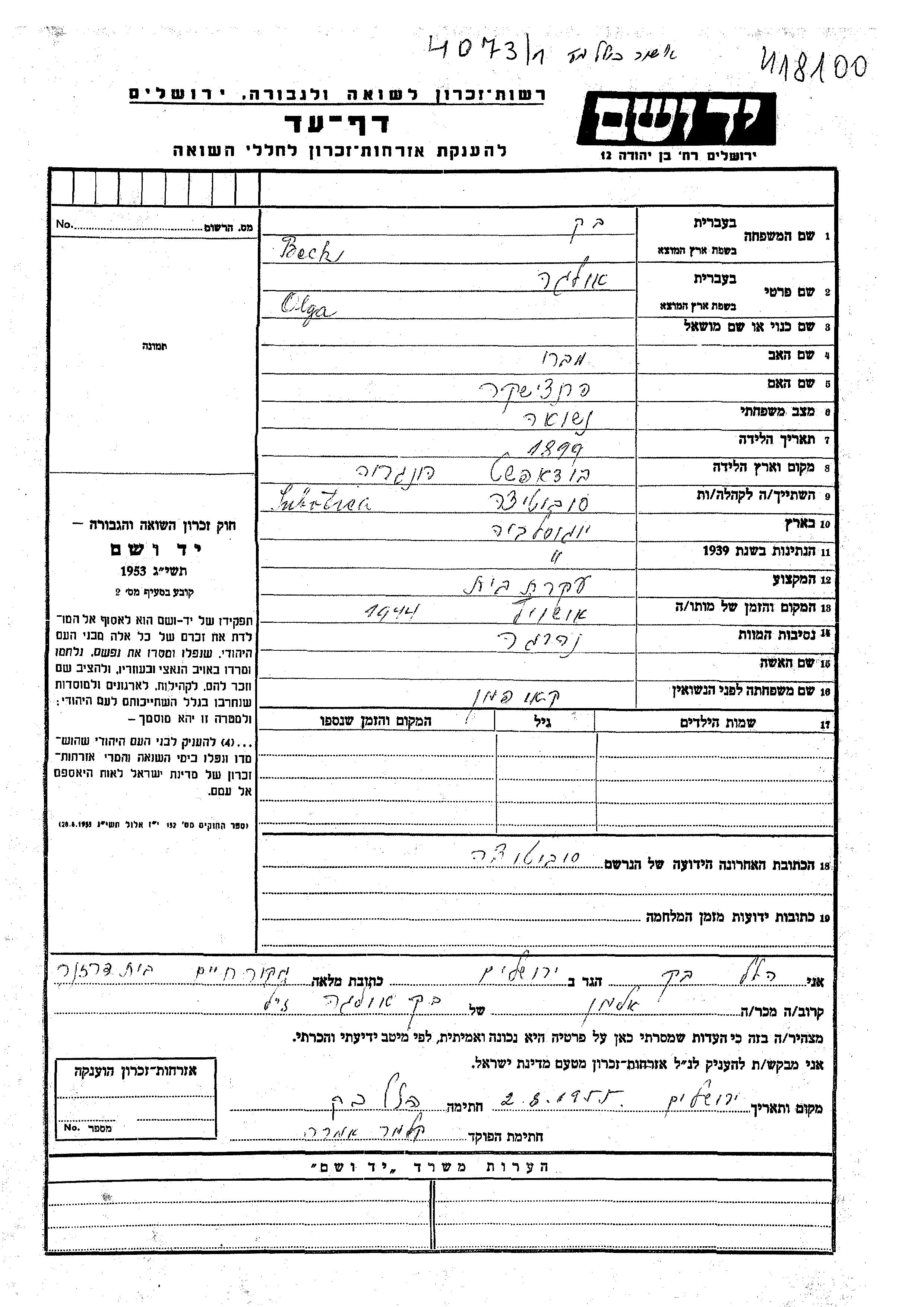 Beck | Olga | 1899 | Subotica, Yugoslavie | Feuille de témoignage |