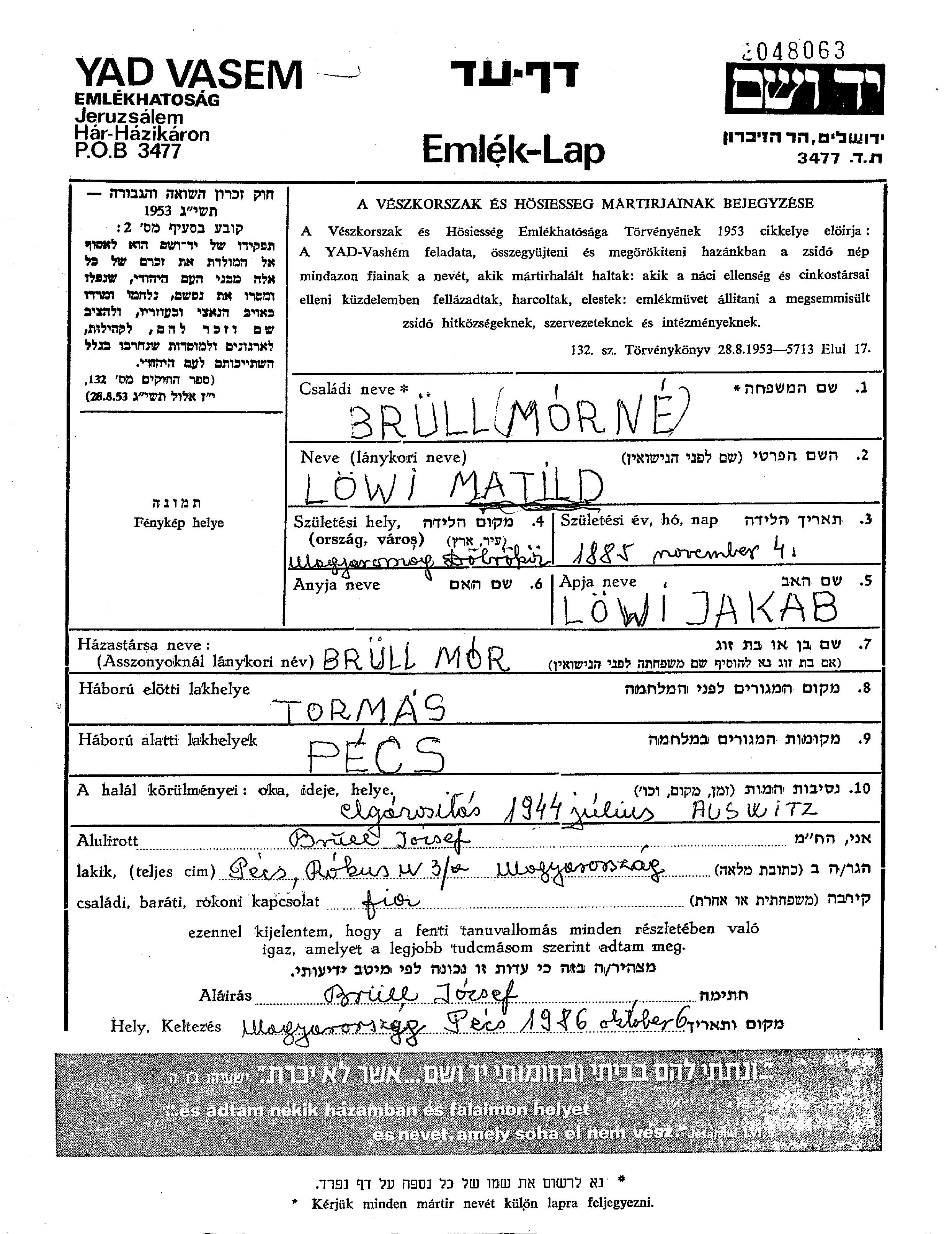 Matild Bruell née Loewi est née à Dobrokoz, Hongrie en 1885, fille de Jakab. Elle était Mariée à Mor. Avant la seconde guerre mondiale elle vivait à Tormas, Hongrie. Pendant la guerre, elle était à Pecs, Hongrie.