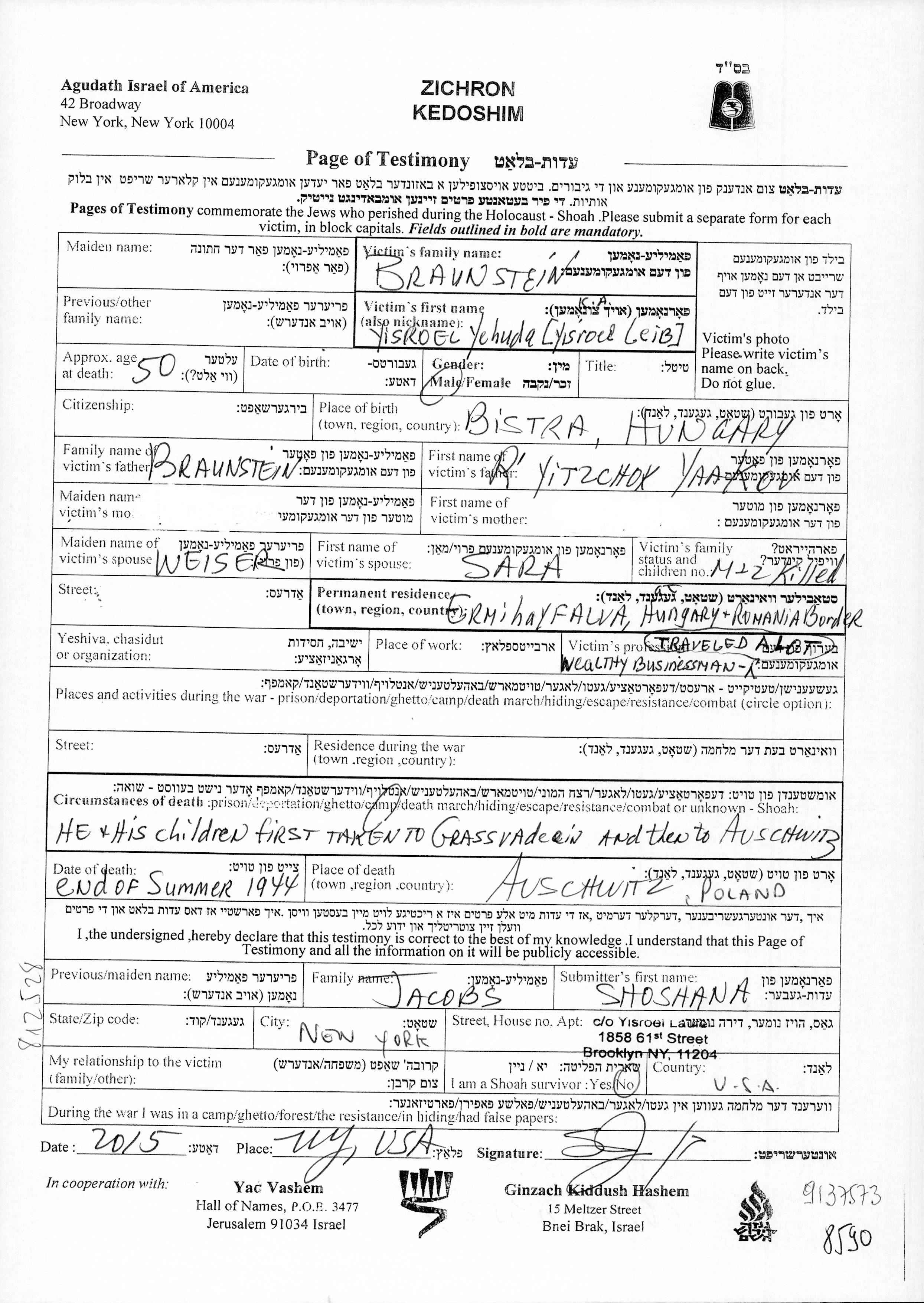 Braunstien Yisroel Leib Yehuda Ermihalyfalva, Roumanie Feuille de témoignage