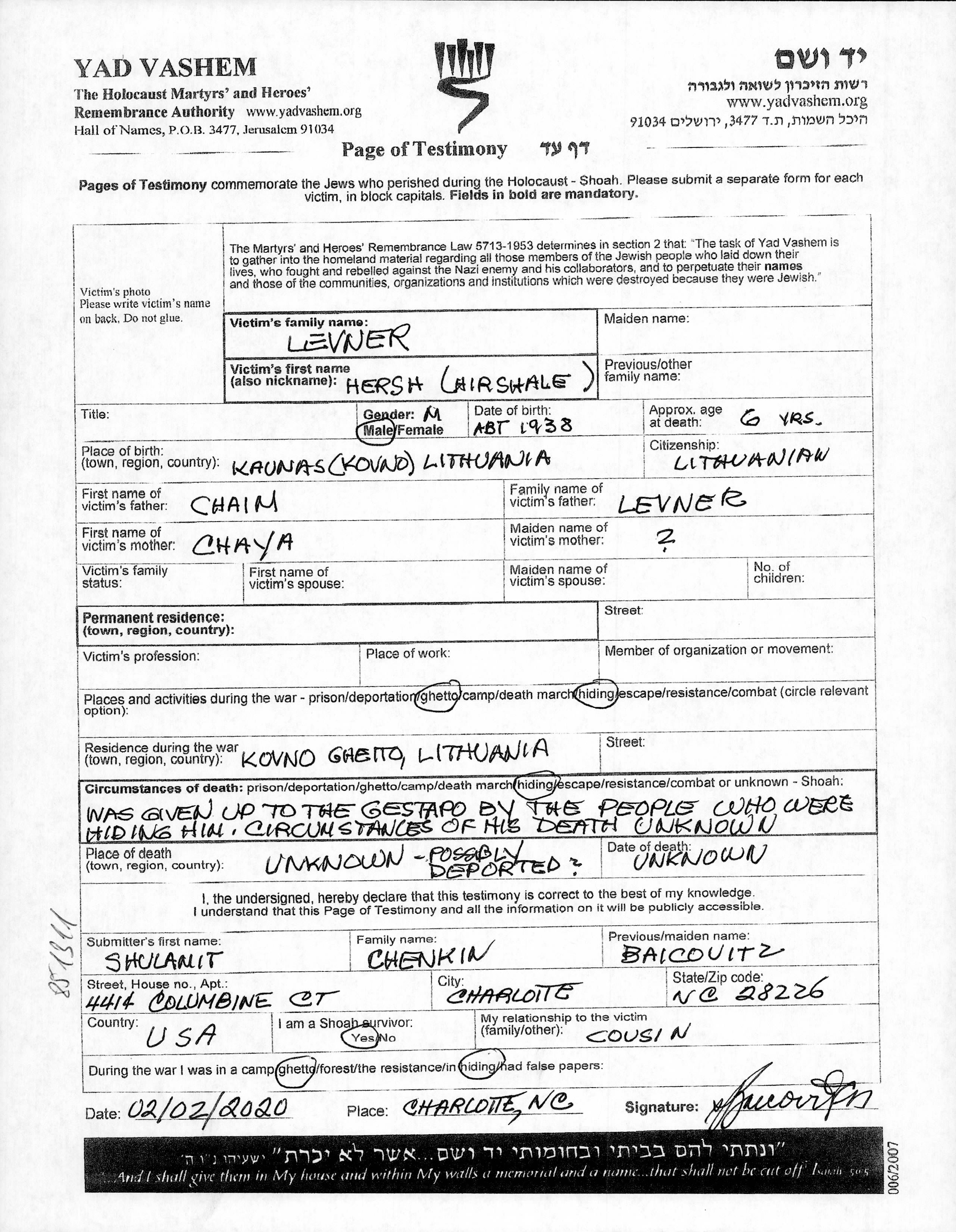 Levner Hersh מקום מגורים לבדיקה, Feuille de témoignage