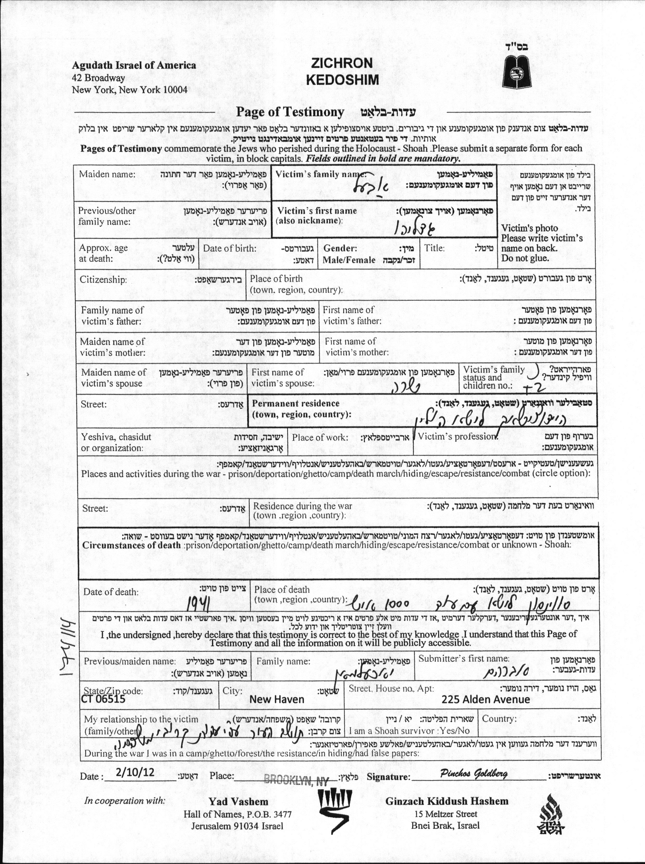 Gdaliyahu Abel est né à Hoduciszki, Pologne en 1912. Il était Propriétaire d'un magasin. Avant la seconde guerre mondiale il vivait à Hoduciszki, Pologne. Gdaliyahu a été assassiné pendant la Shoah.