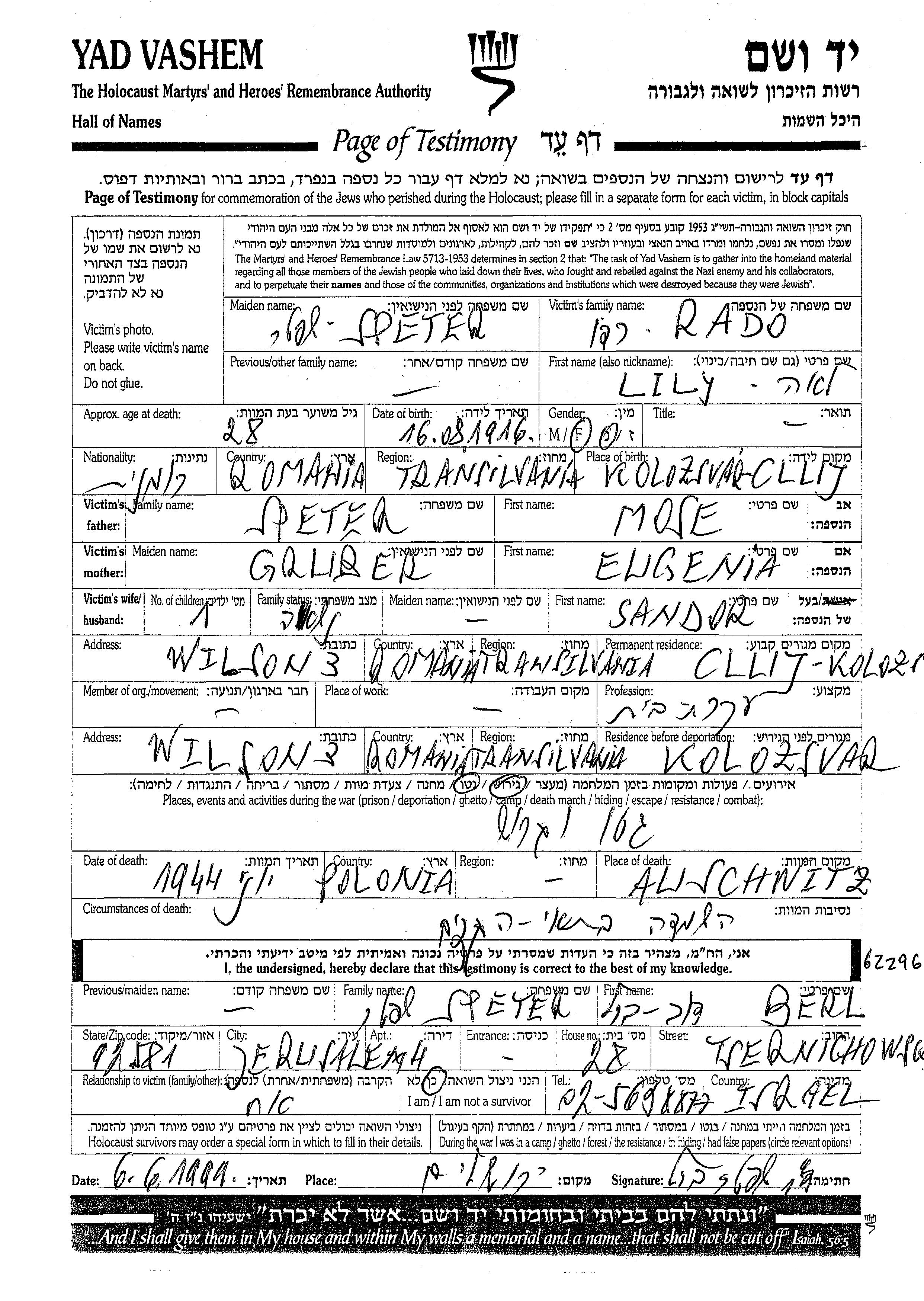 Rado | Lily | 1916 | Cluj, Roumanie | Feuille de témoignage |