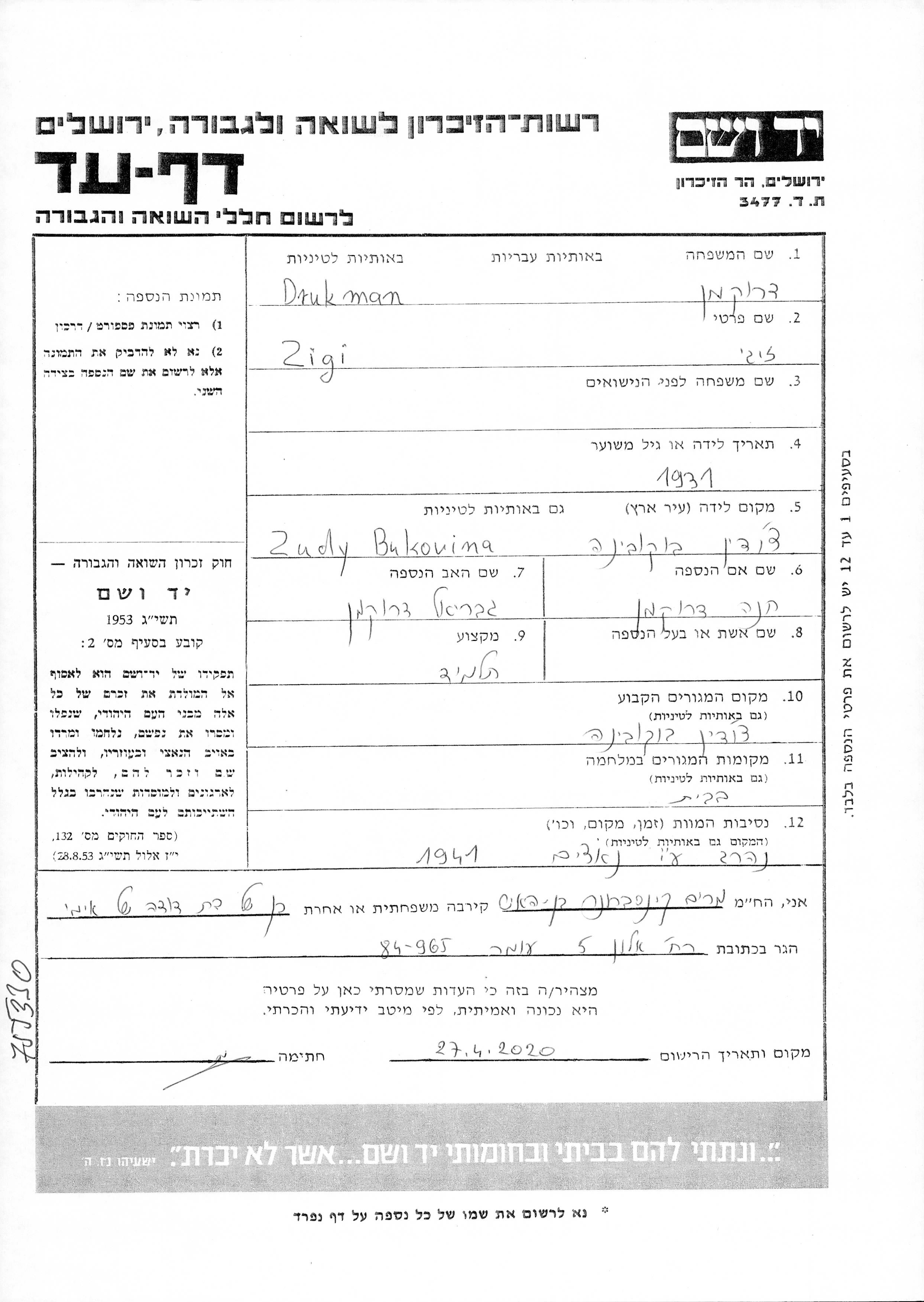 Drukman Zigi 1931 Chudin, Roumanie Feuille de témoignage