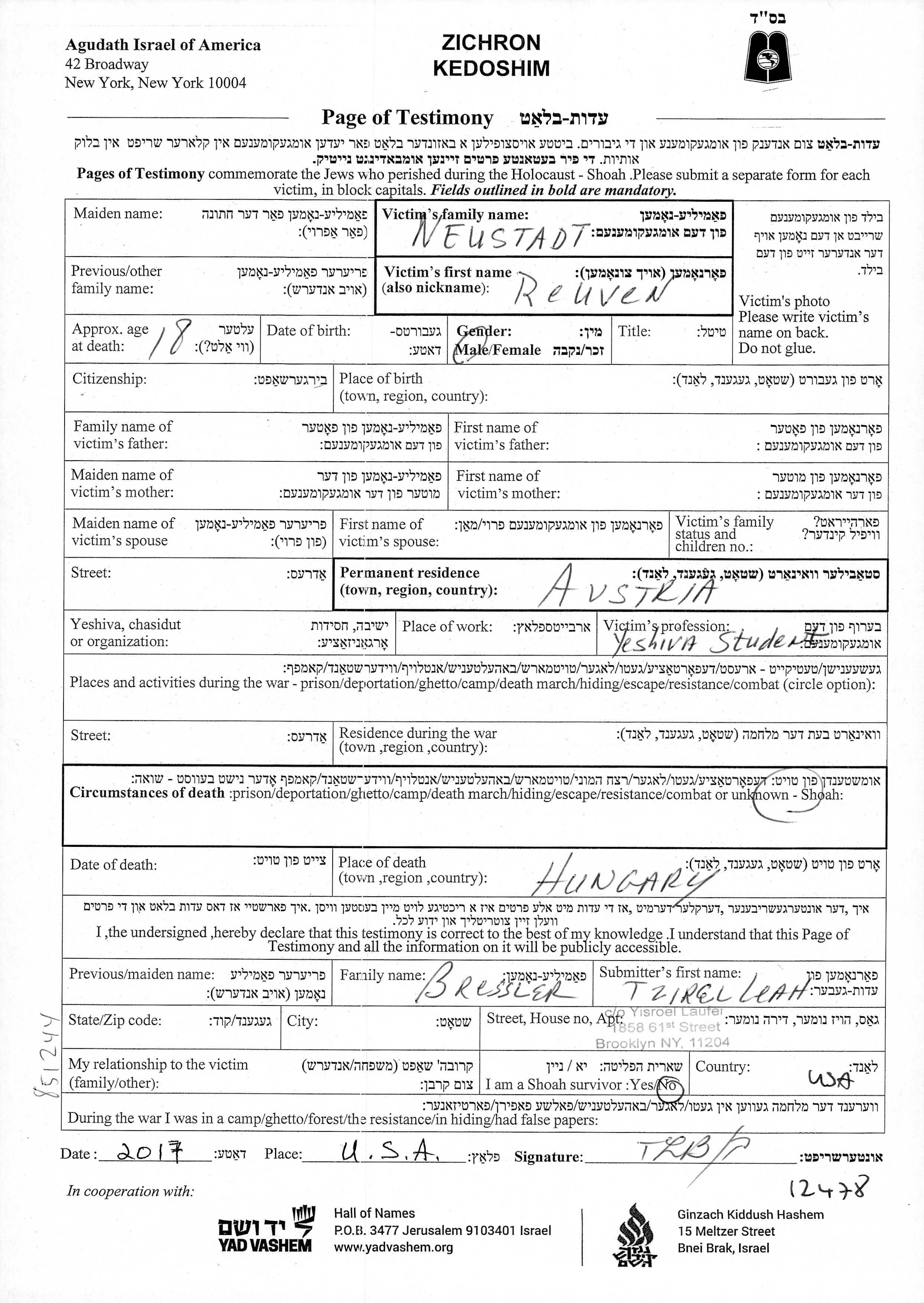 Reuven Neustadt. Il était Élève de yéshiva. Avant la seconde guerre mondiale il vivait à Autriche.