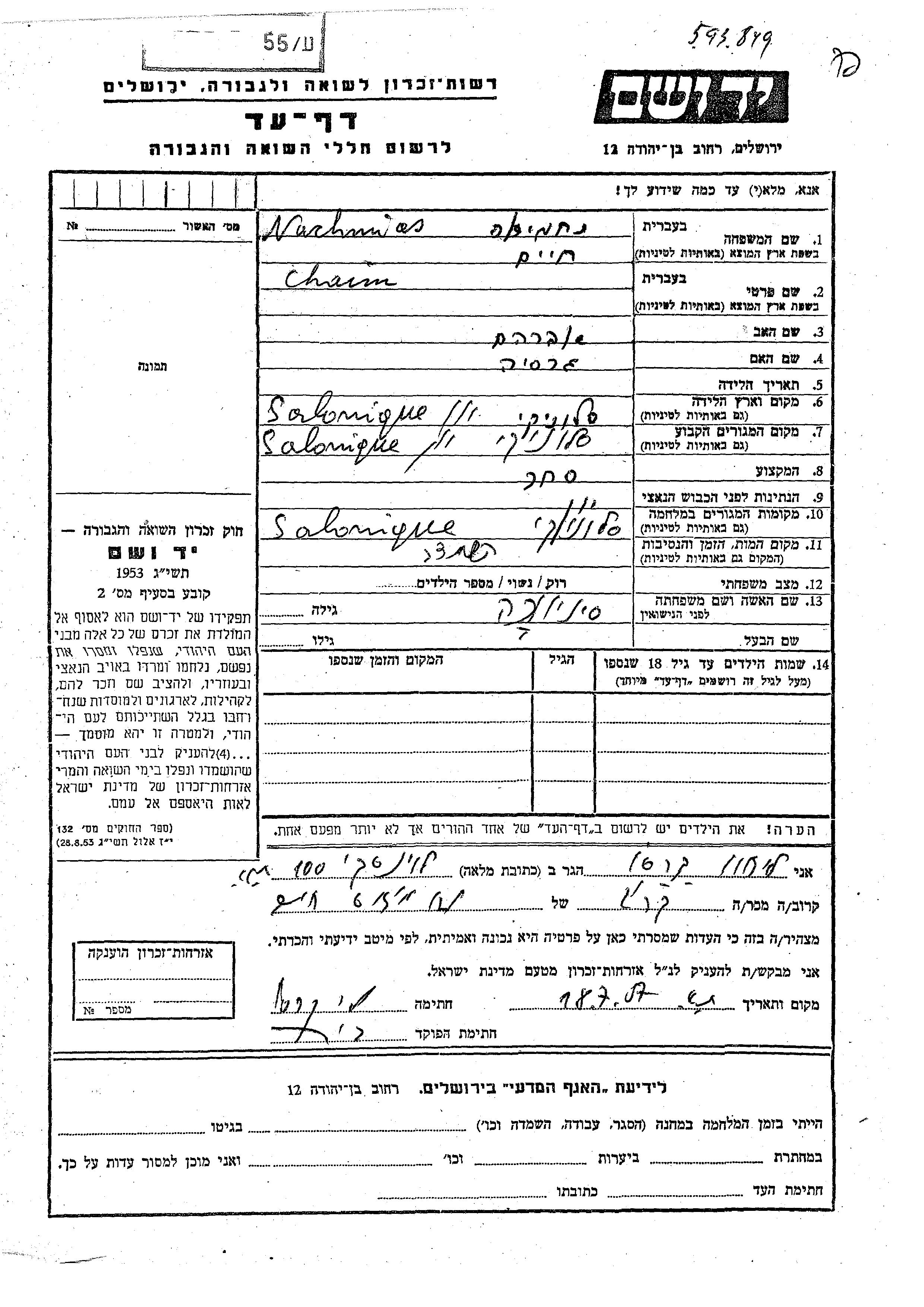 Nachmias Chaim Salonique, Grèce Feuille de témoignage