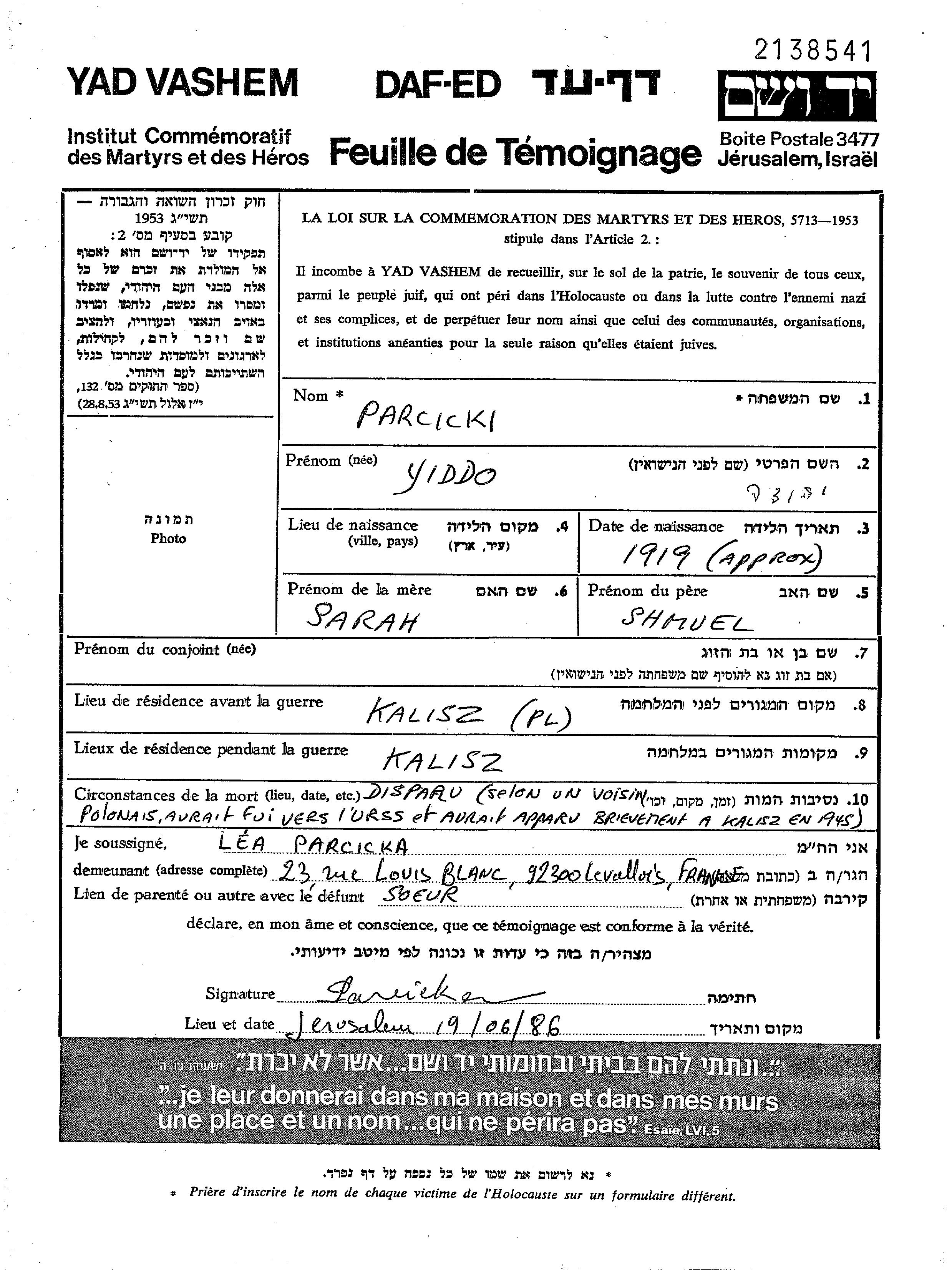 Yiddo Ido Parcicki est né en 1919, fils de Shmuel et de Sarah née Majerovicz. Avant la seconde guerre mondiale il vivait à Kalisz, Pologne. Au cours de la guerre, il était à Union soviétique.