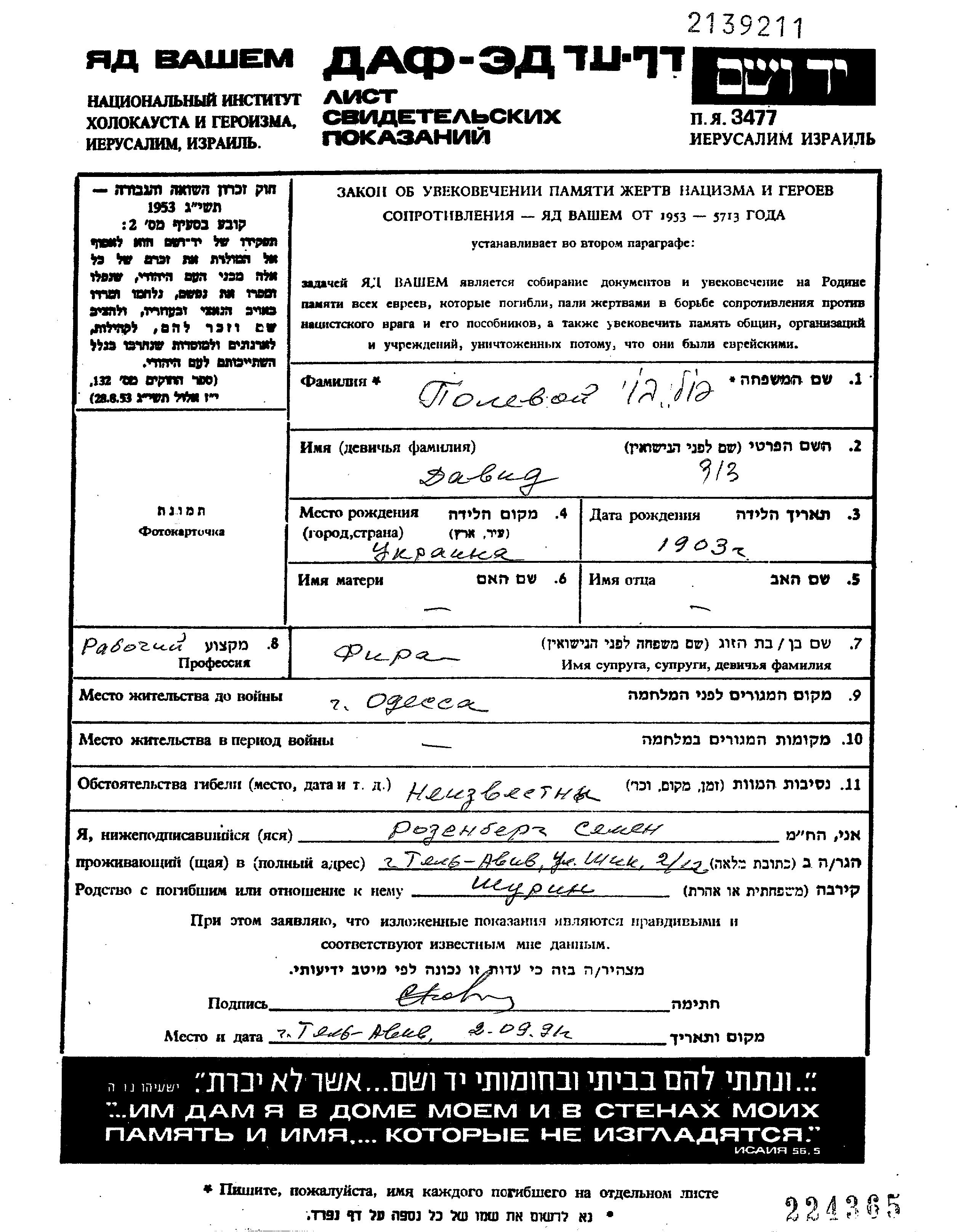 David Polevoi est né à Ukraine (URSS). Il était Ouvrier/e et Mariée à Fira. Avant la seconde guerre mondiale il vivait à Odessa, Ukraine (URSS).