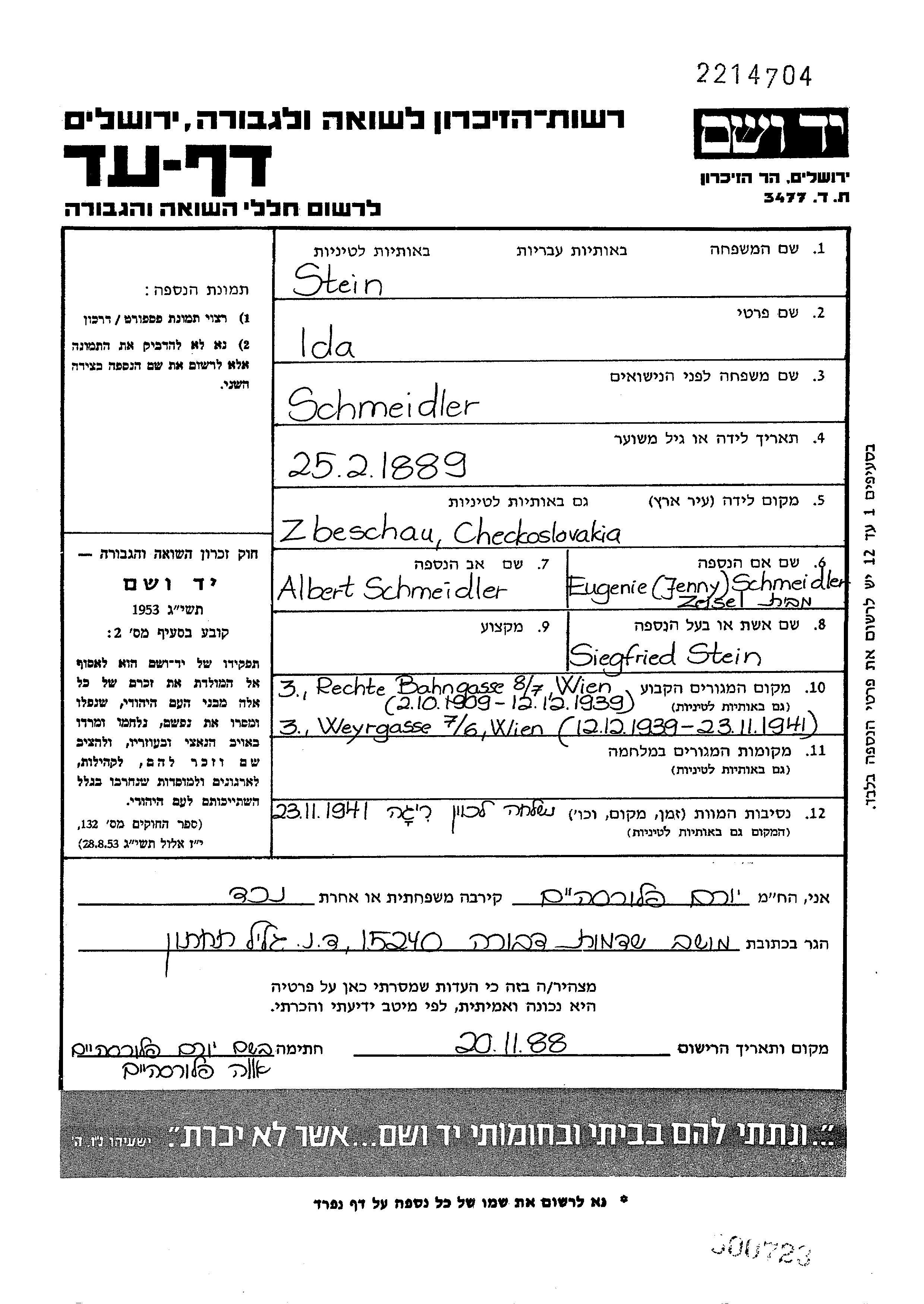 Ida Stein née Schmeidler est née à Zbysov, Tchécoslovaquie en 1889. Avant la seconde guerre mondiale elle vivait à Wien, Autriche.