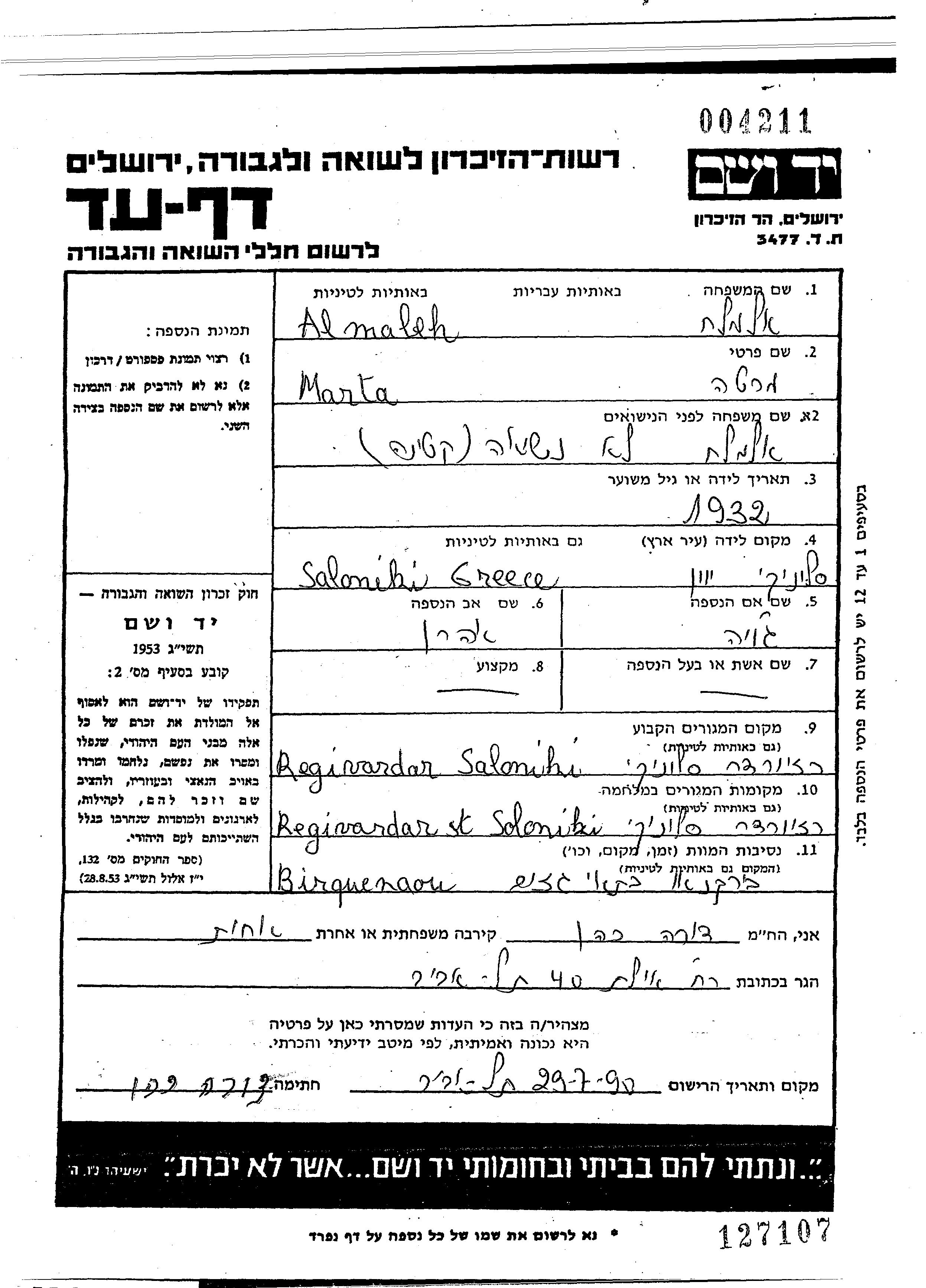 Almaleh | Marta | 1932 | Saloniki, Grèce | Feuille de témoignage |