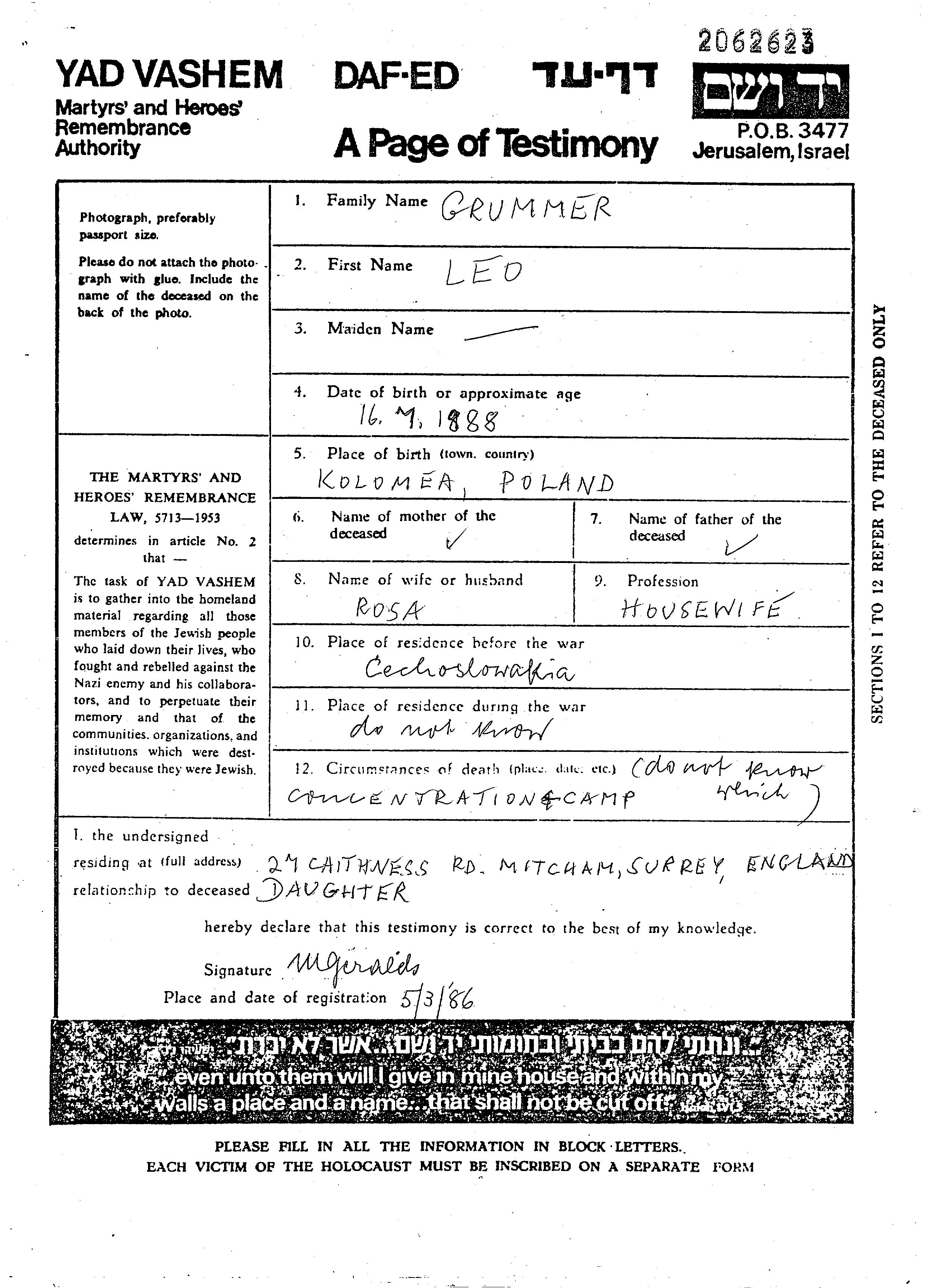 Leo Grummer est né à Kolomyja, Pologne en 1888. Il était Tapissier et Mariée à Rosa. Avant la seconde guerre mondiale il vivait à Tchécoslovaquie.
