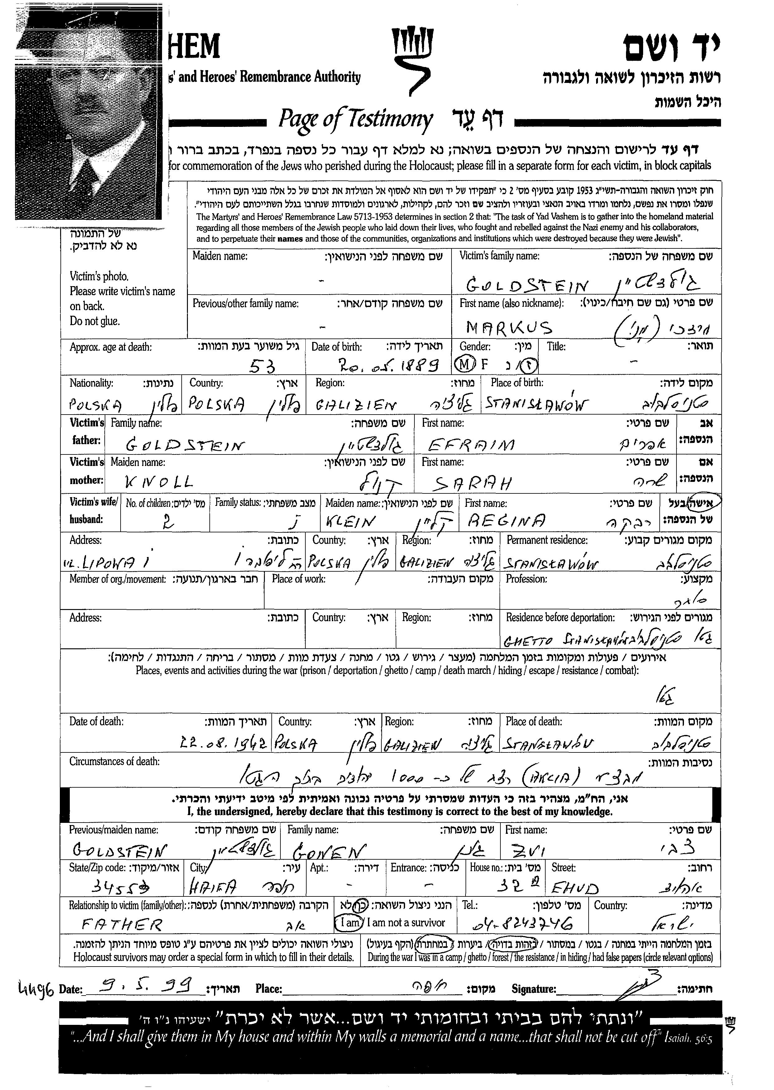 Goldstein Mordekhai Maria Markus 1889 Stanislawow, Pologne Feuille de témoignage