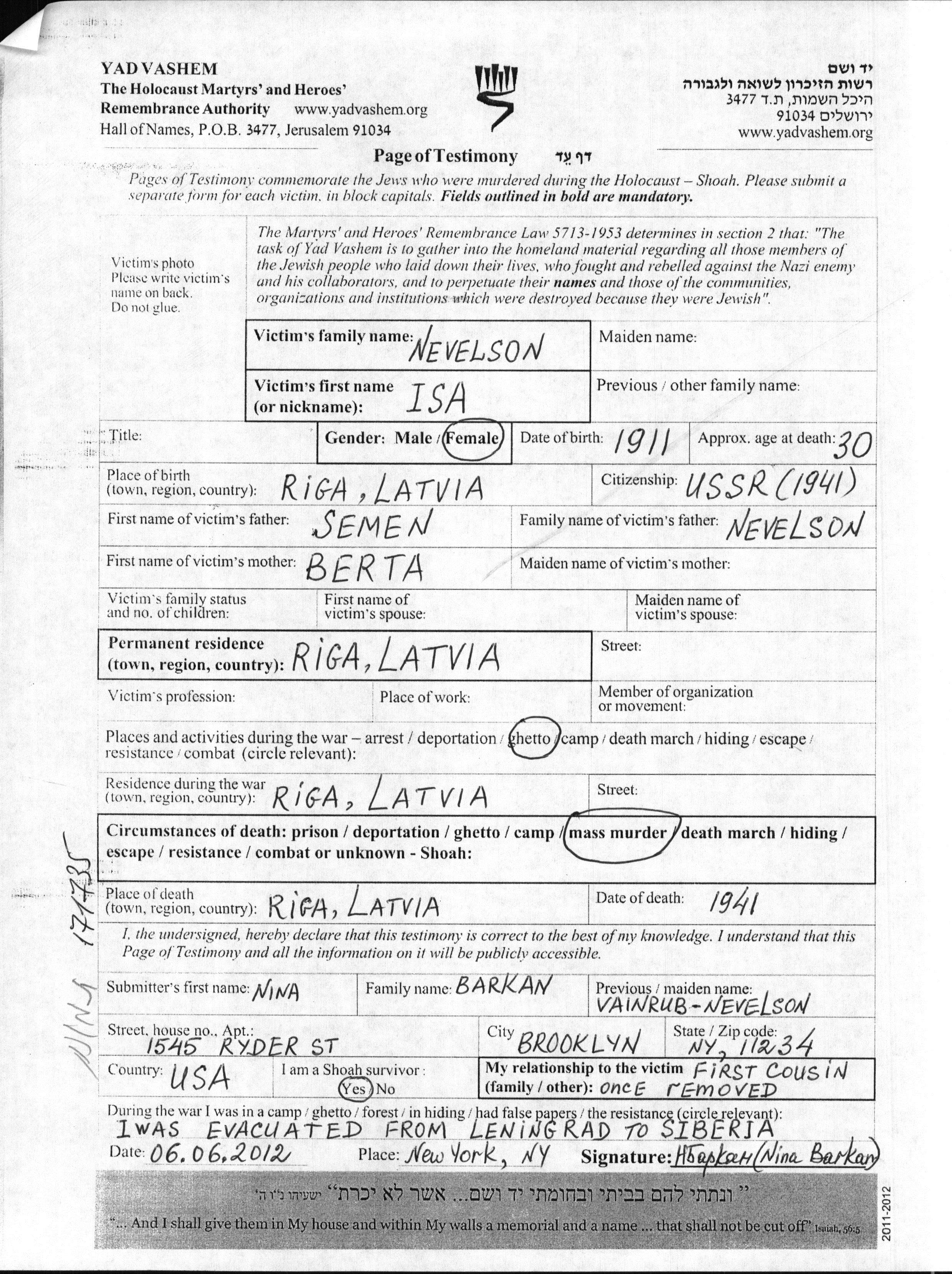 Isa Nevelson est née à Riga, Lettonie en 1911. Avant la seconde guerre mondiale elle vivait à Riga, Lettonie.