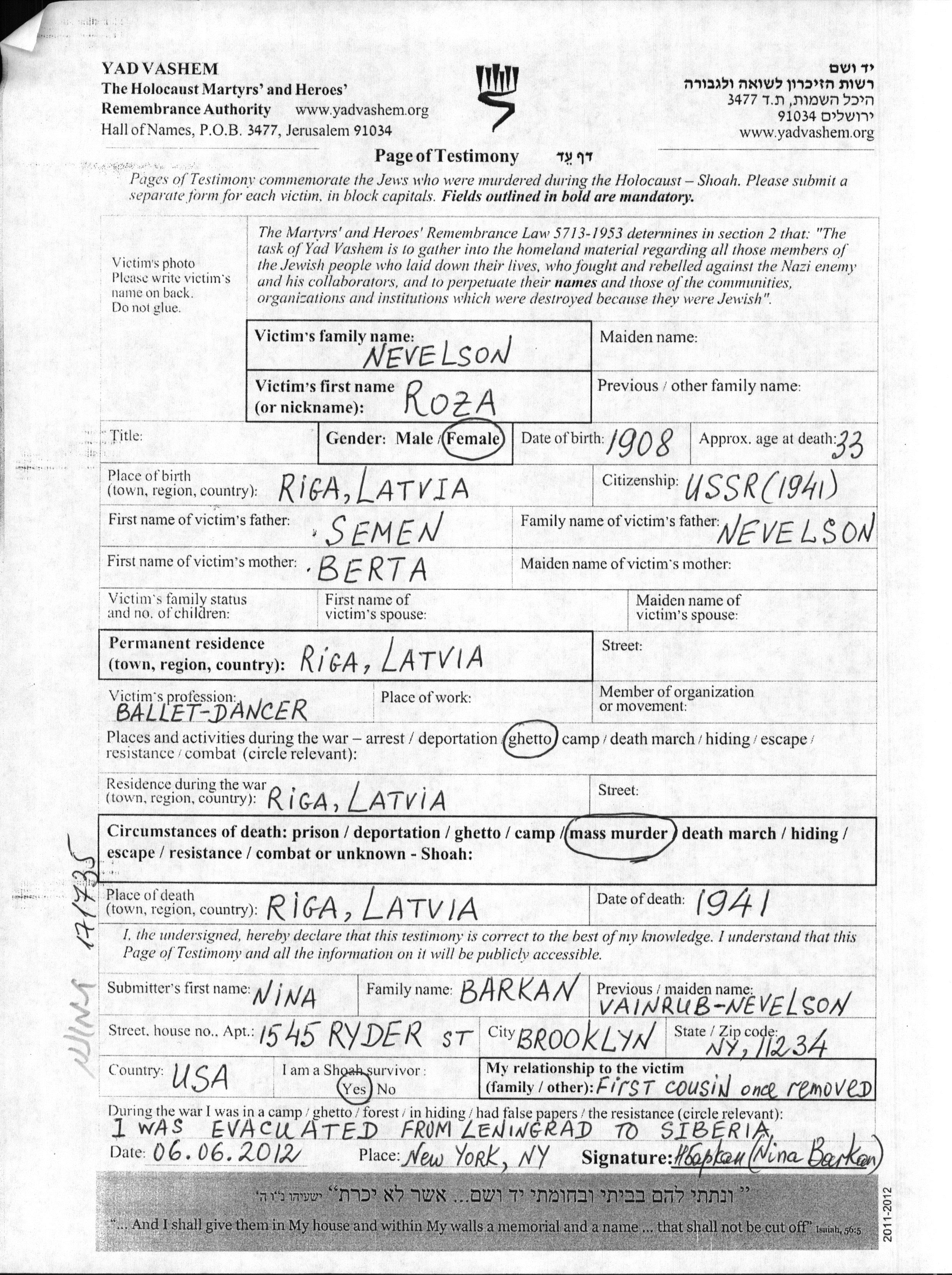 Nevelson | Roza | 1908 | Riga, Lettonie | Feuille de témoignage |