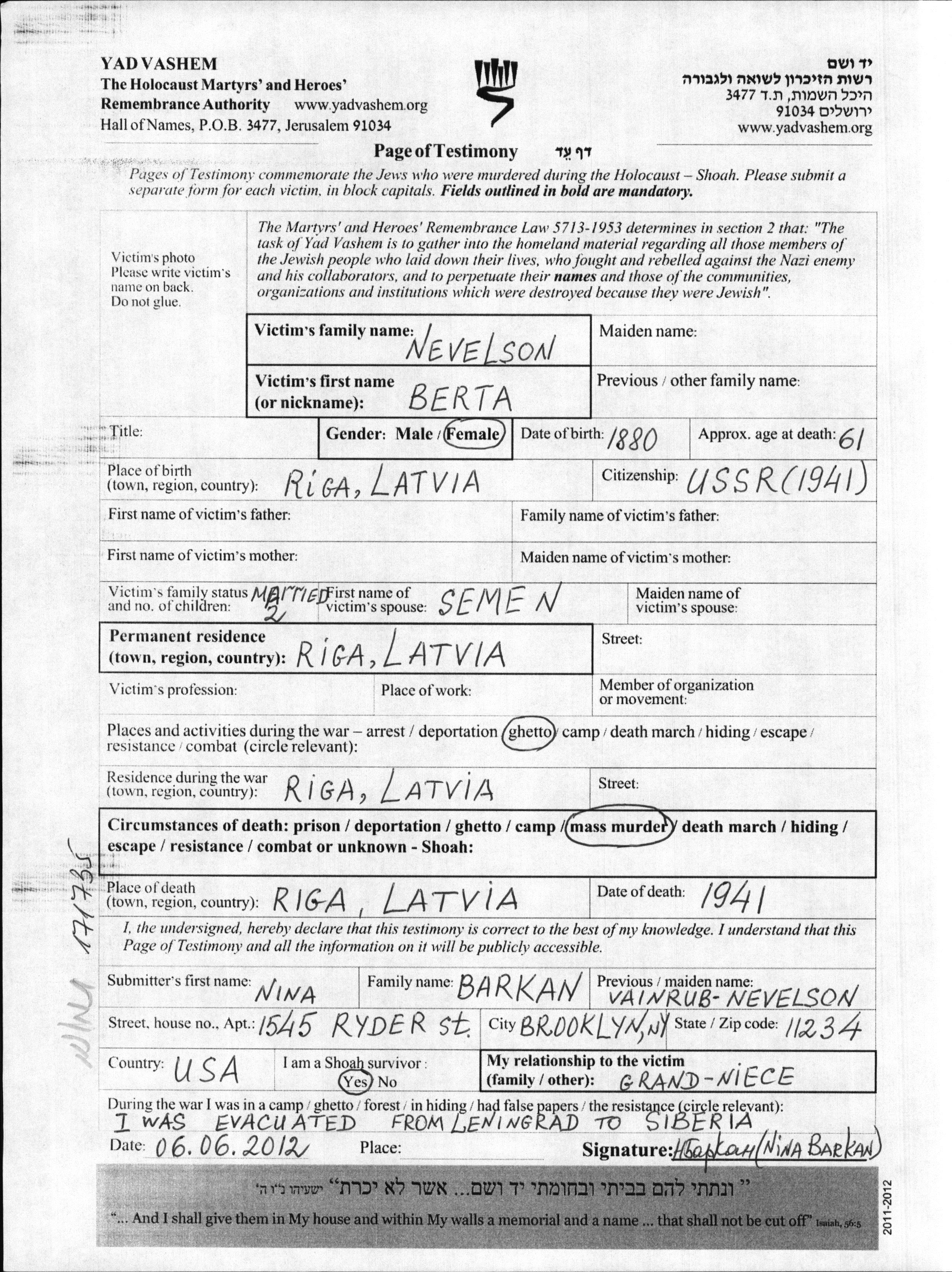 Nevelson Berta 1880 Riga, Lettonie Feuille de témoignage