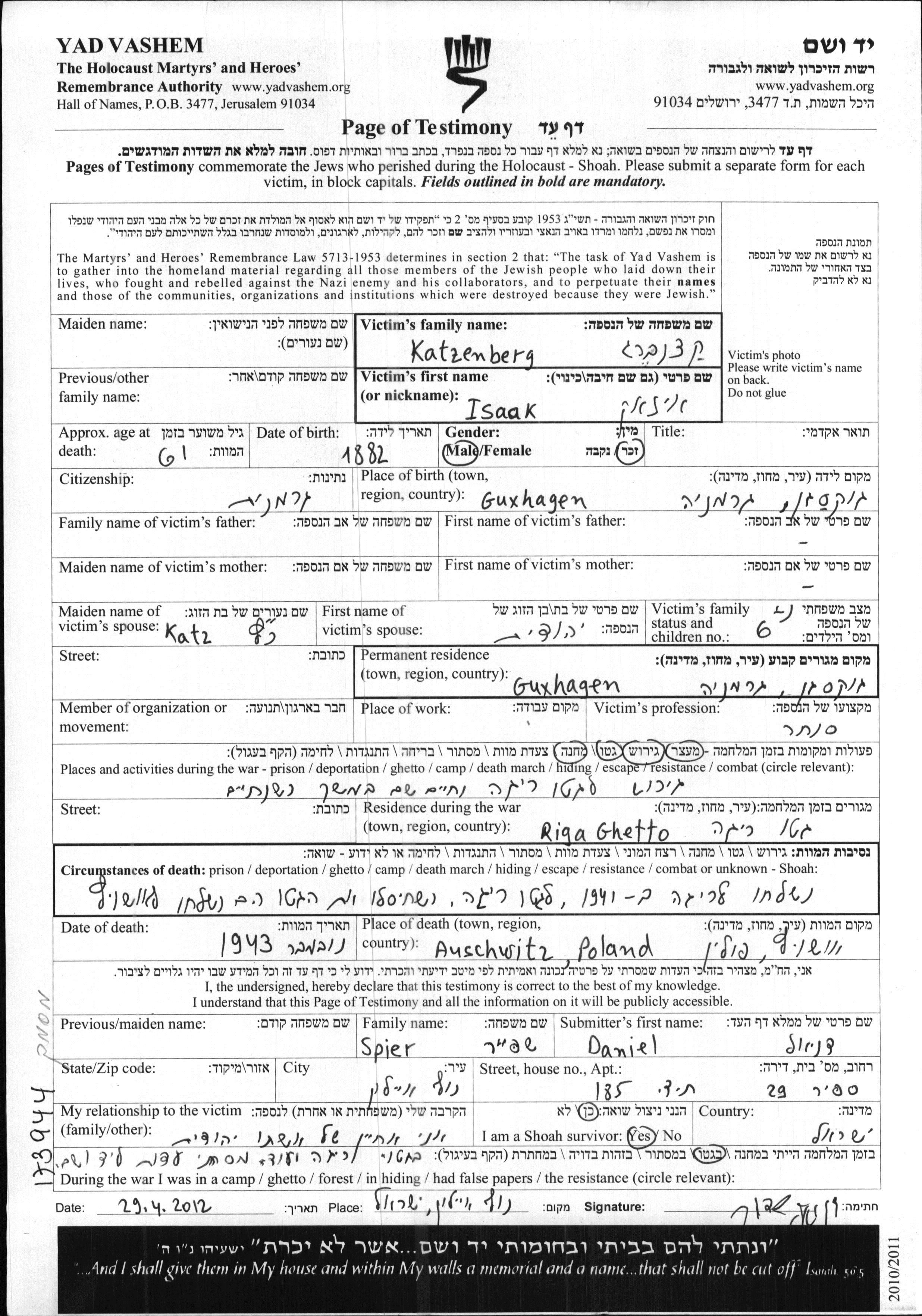Katzenberg Isaak endroit inconnu, Documents personnels