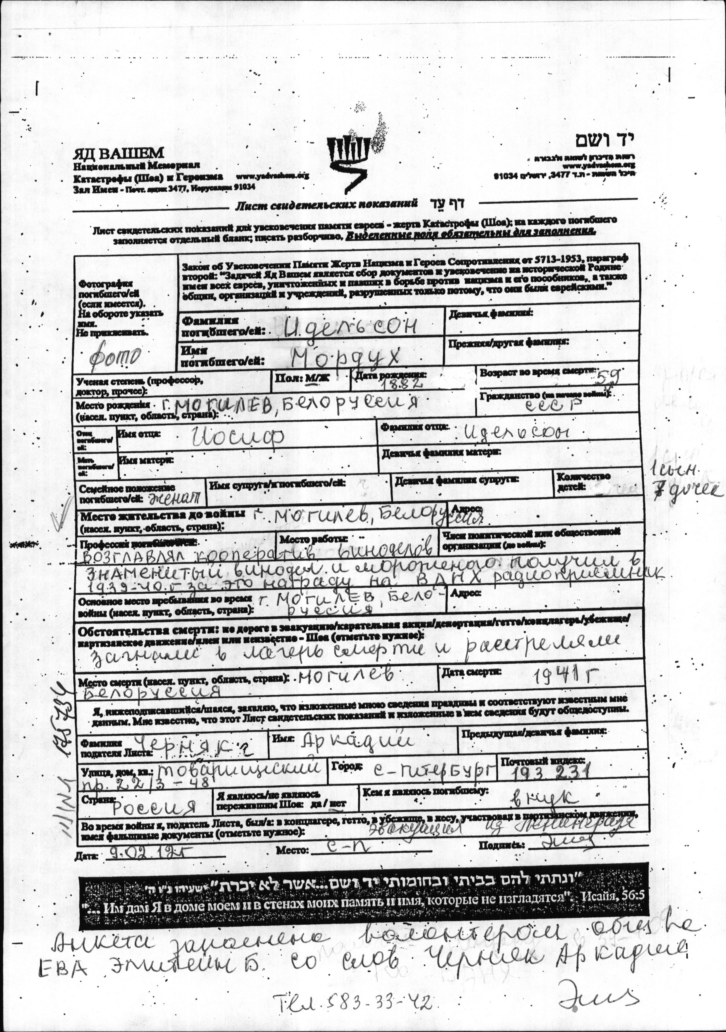 Idelson Mordukh 1882 Mogilev, Bélorussie (URSS) Feuille de témoignage