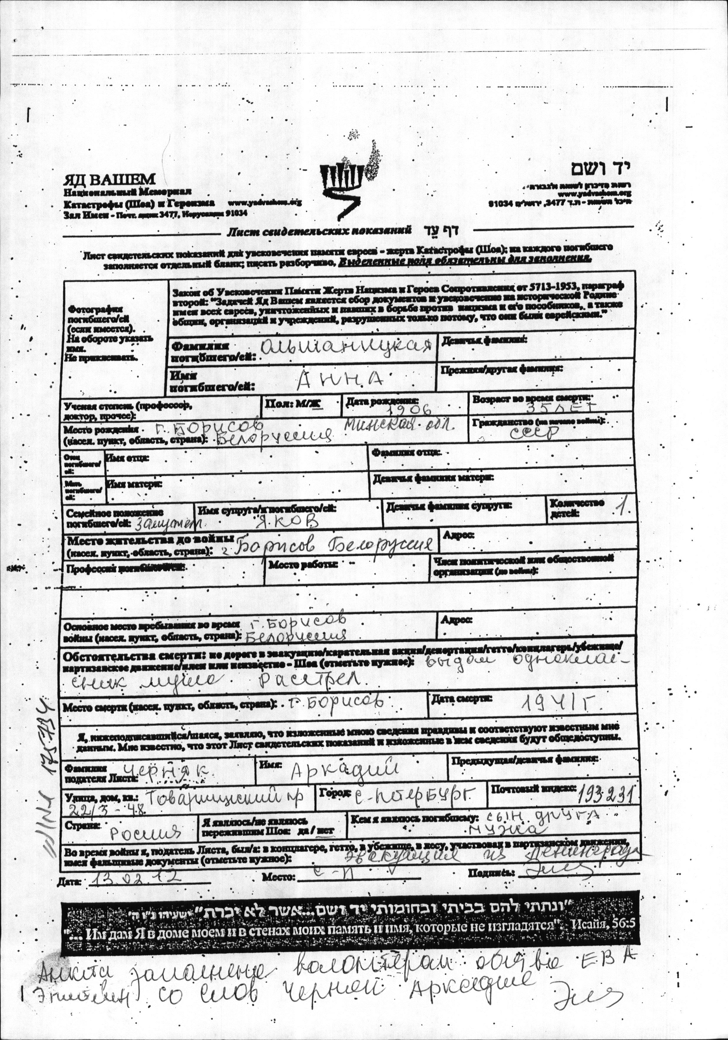 Olshanitzkaya | Anna | Borisov, Bélorussie (URSS) | Feuille de témoignage | |